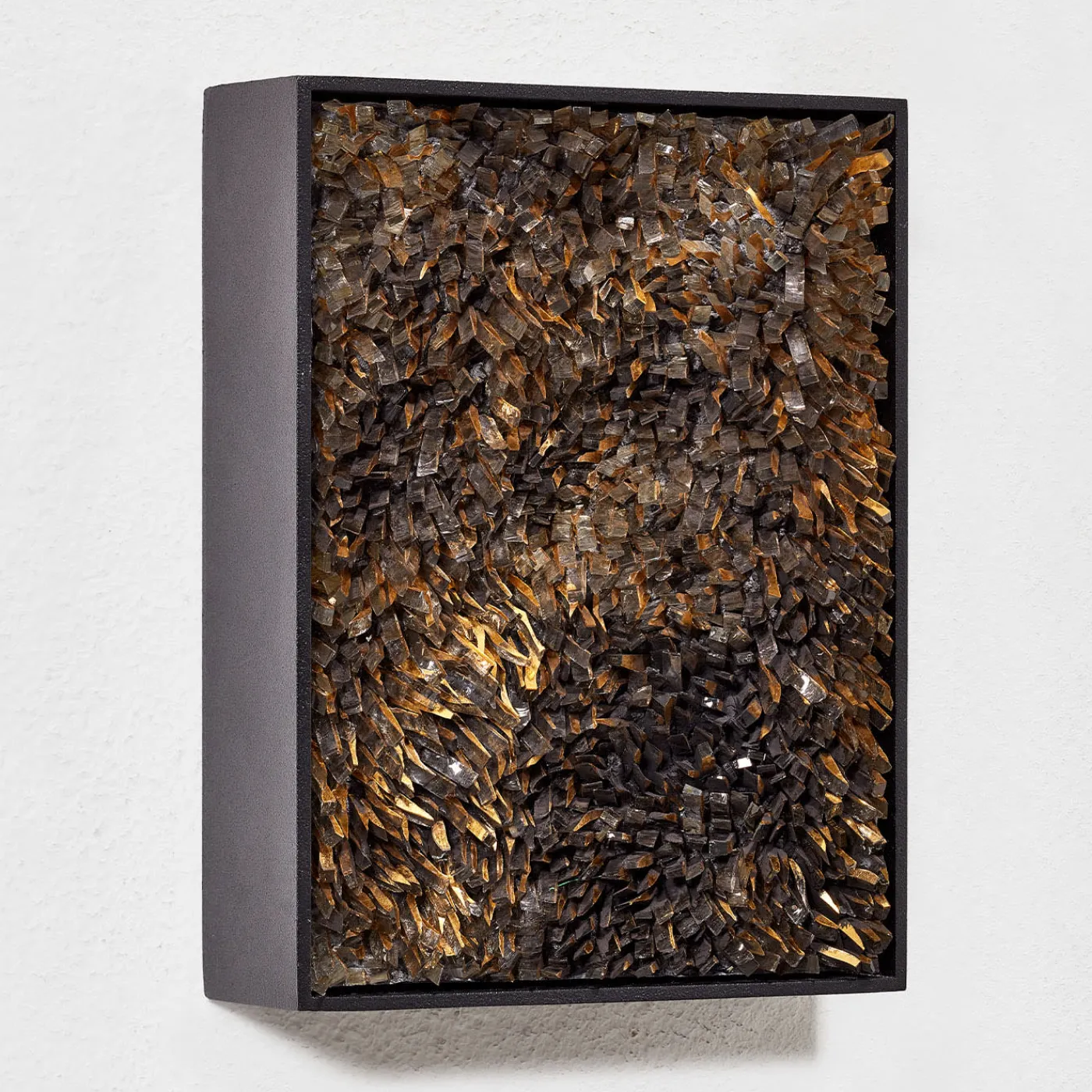 Una creazione unica che presenta pasta di vetro con foglia d’oro, ossido colorante e malta, incastonata su legno e ferro multistrato. Questo pezzo eccezionale, intitolato “Movimento n231”, fonde materiali eleganti per trasmettere un’espressione artistica dinamica.