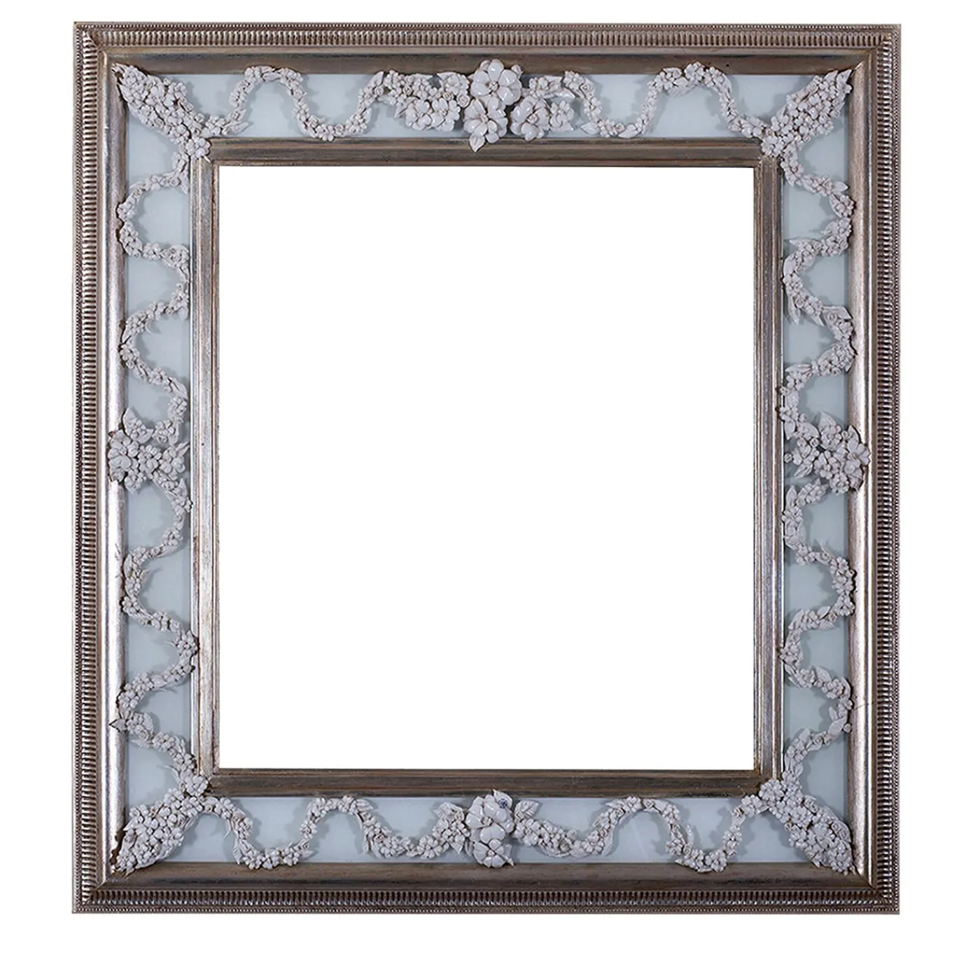 Elegante cornice in legno dorato con foglia d’argento, fascia in vetro bianco e applicazioni di rose in porcellana di Capodimonte. Per ulteriori informazioni, contattare il servizio di Concierge.