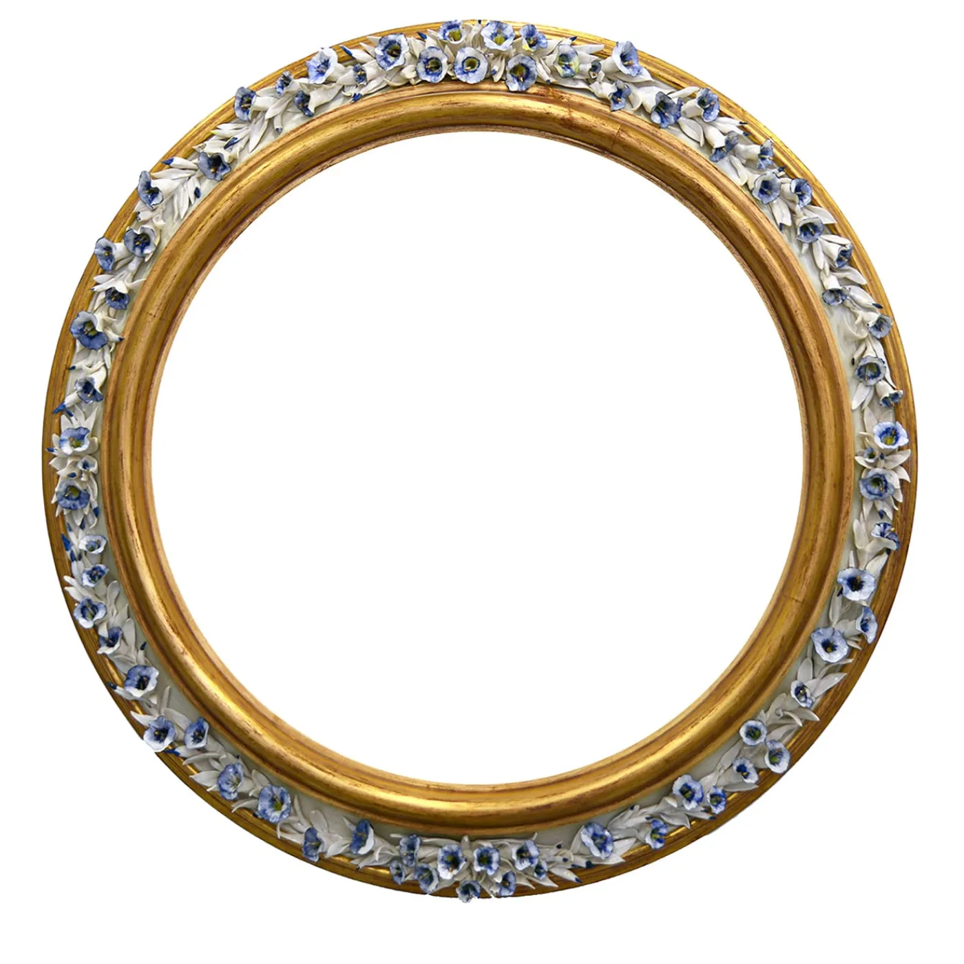 Cornice in porcellana bianca e dorata laccata in legno con foglia d’oro e circondata da fiori a campana in pregiata porcellana capodimonte colorata di azzurro cotto a terza cottura. La composizione dei fiori sapientemente disposti rende la cornice una vera e propria opera d’arte. Per ulteriori informazioni, contattare il servizio Concierge.