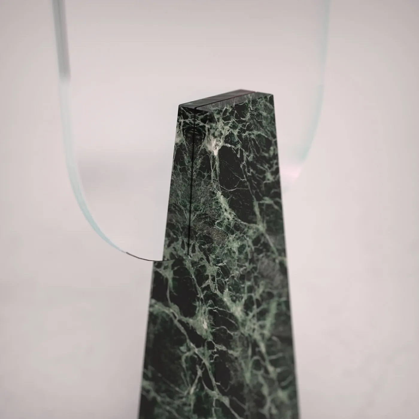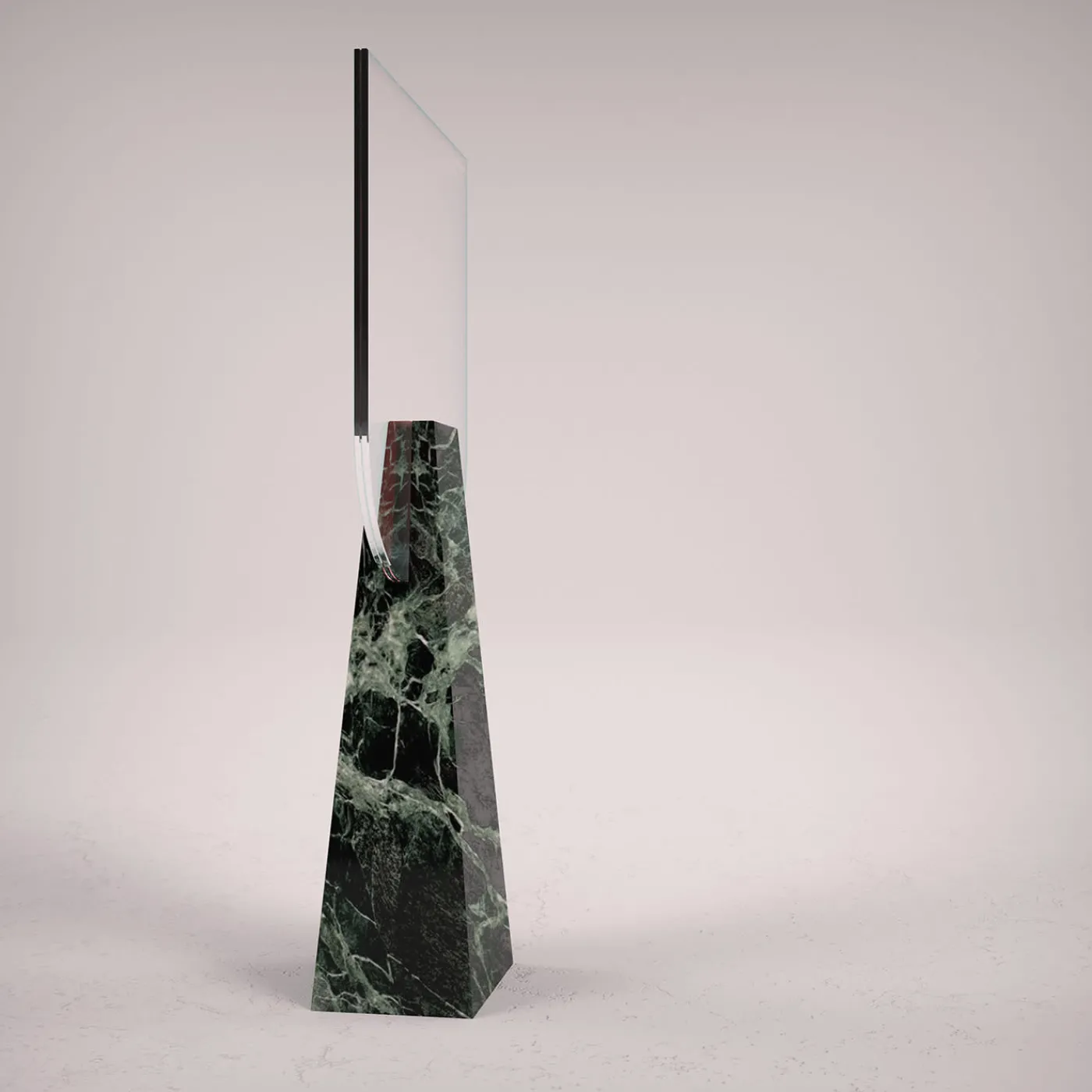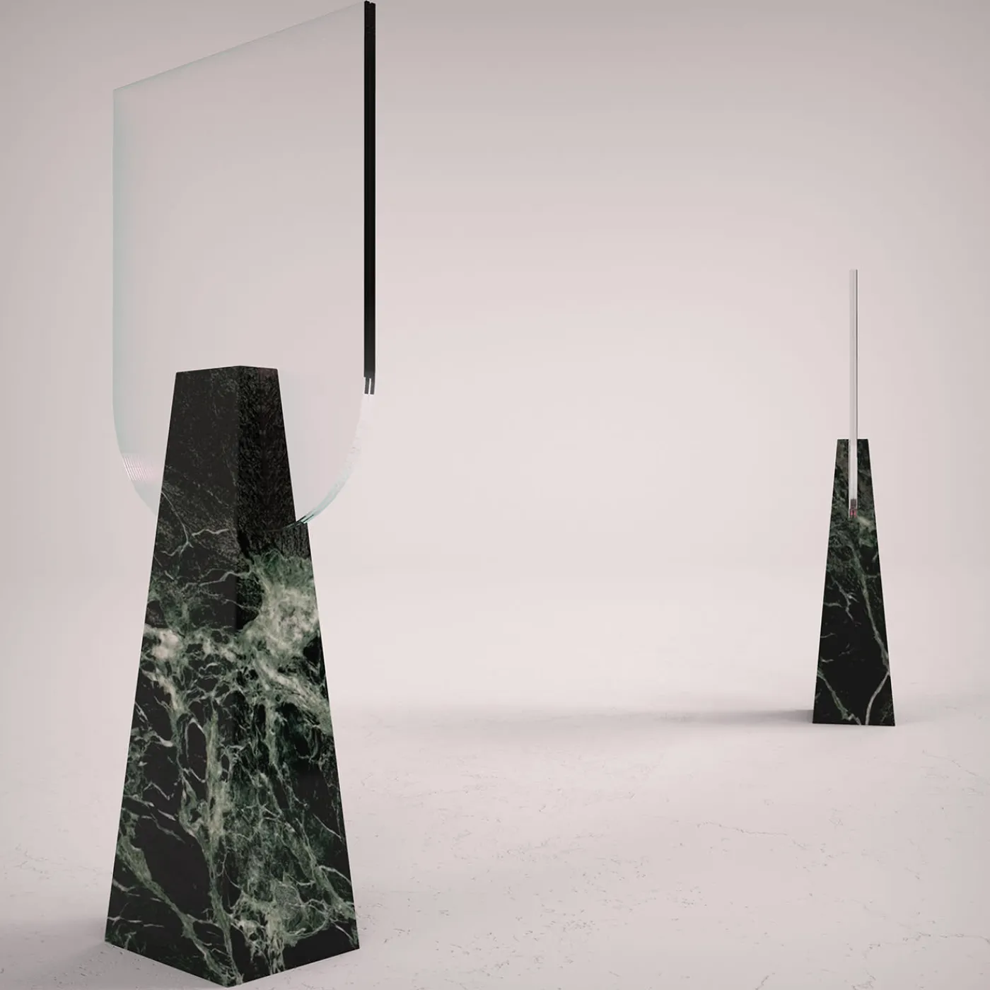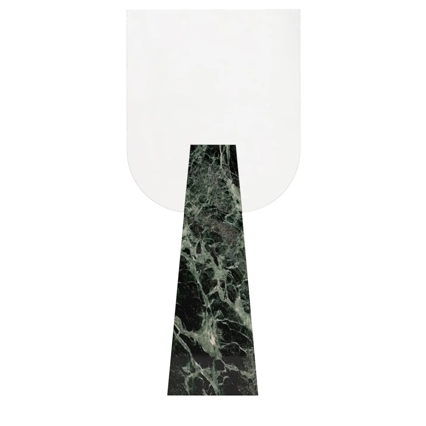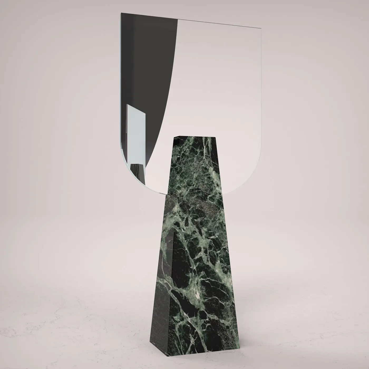 Armonia neoclassica e minimalismo contemporaneo si fondono in questo superbo specchio da tavolo di sorprendente opulenza. I risultati dello specchio bifacciale, abilmente modellati a mano, sono inseriti e tenuti in posizione da un corpo monoblocco rigorosamente scolpito in pregiato marmo Verde Alpi, la cui texture liscia contribuisce ad affermare la sua irripetibile natura artigianale. Ogni pezzo è numerato e realizzato su ordinazione.