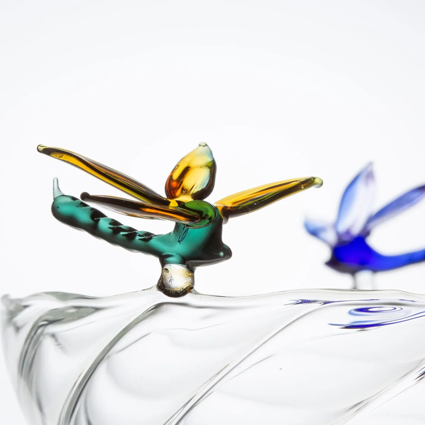 Sapientemente realizzato a mano da artigiani veneziani, questo piatto da frutta in vetro trasparente a righe presenta tre libellule multicolore nei colori blu intenso, bordeaux e rosa, verde e giallo sorbetto, delicatamente appoggiate sul bordo. Creato in collaborazione con Summerill & Bishop London, simboleggia equilibrio e tranquillità , fondendo l’arte con la raffinata artigianalità italiana. Ogni pezzo è unico e celebra l’eleganza della lavorazione del vetro.