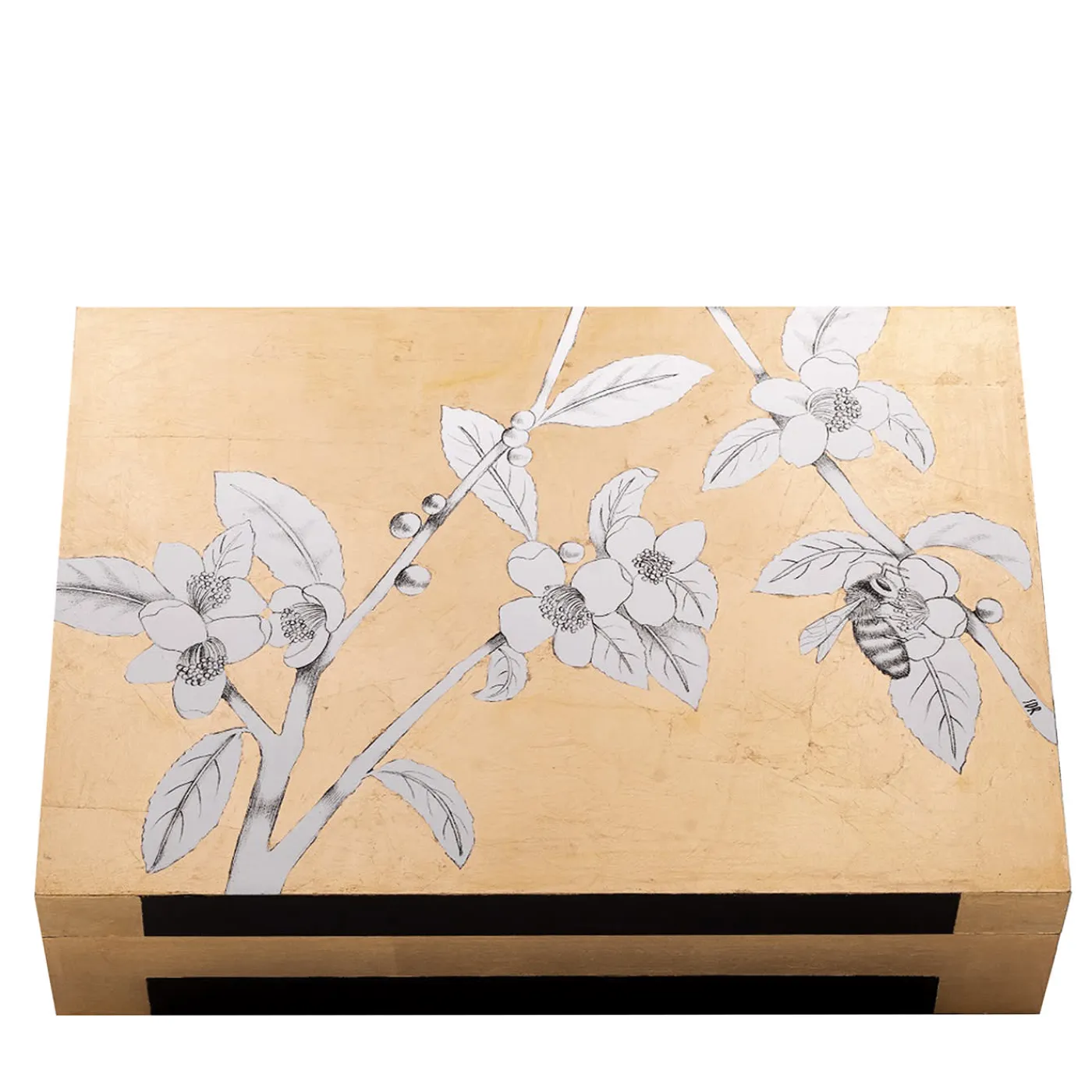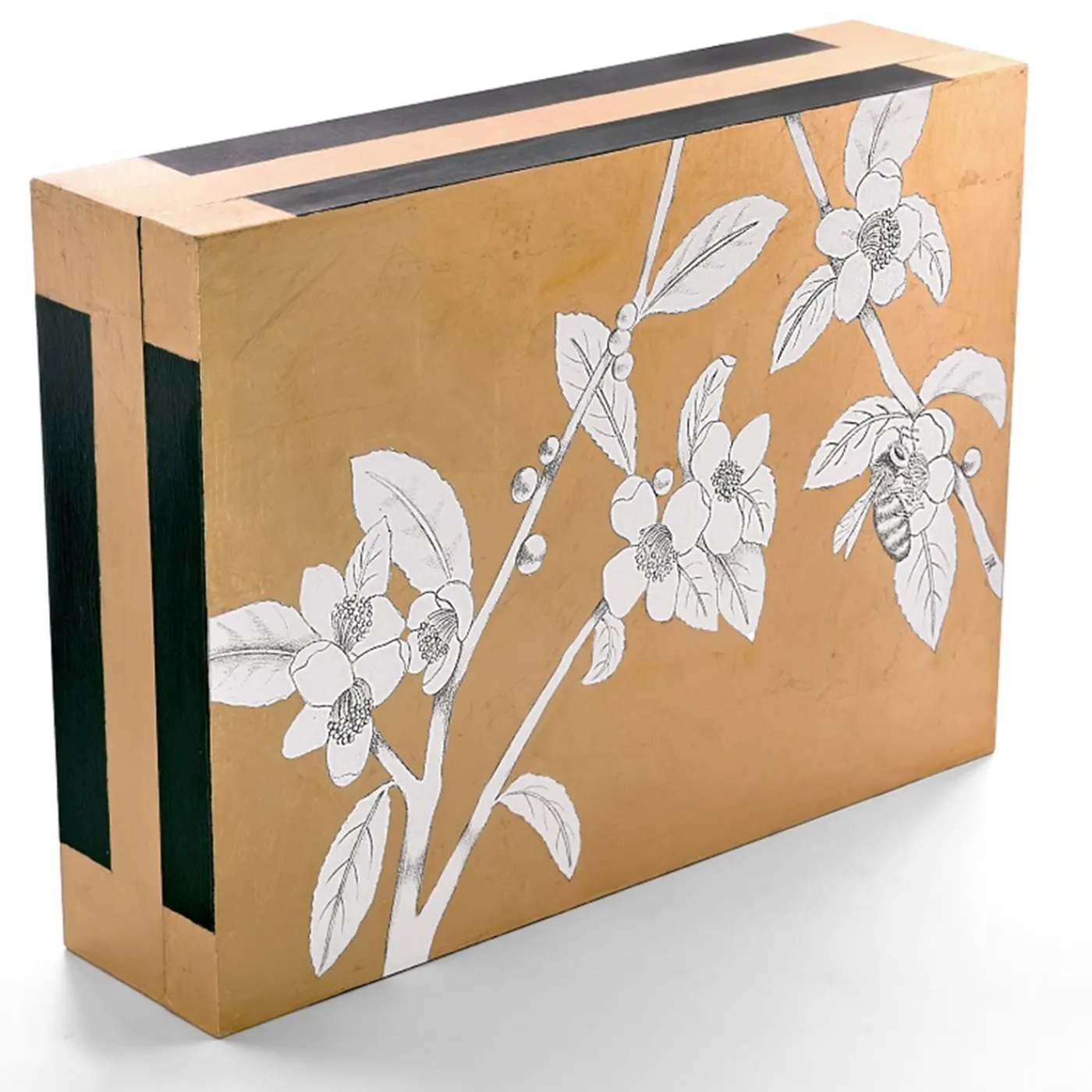 Scatola realizzata a mano con applicazione di foglia d’oro su disegno in grafite. Un’ape vola da un fiore di tè all’altro, in un cielo cosparso d’oro, realizzato da Stefania con le sue magistrali pennellate. Interamente decorata a mano con foglia d’oro sulla stampa di un disegno originale in grafite. Rifinito con gommalacca. L’interno è laccato.