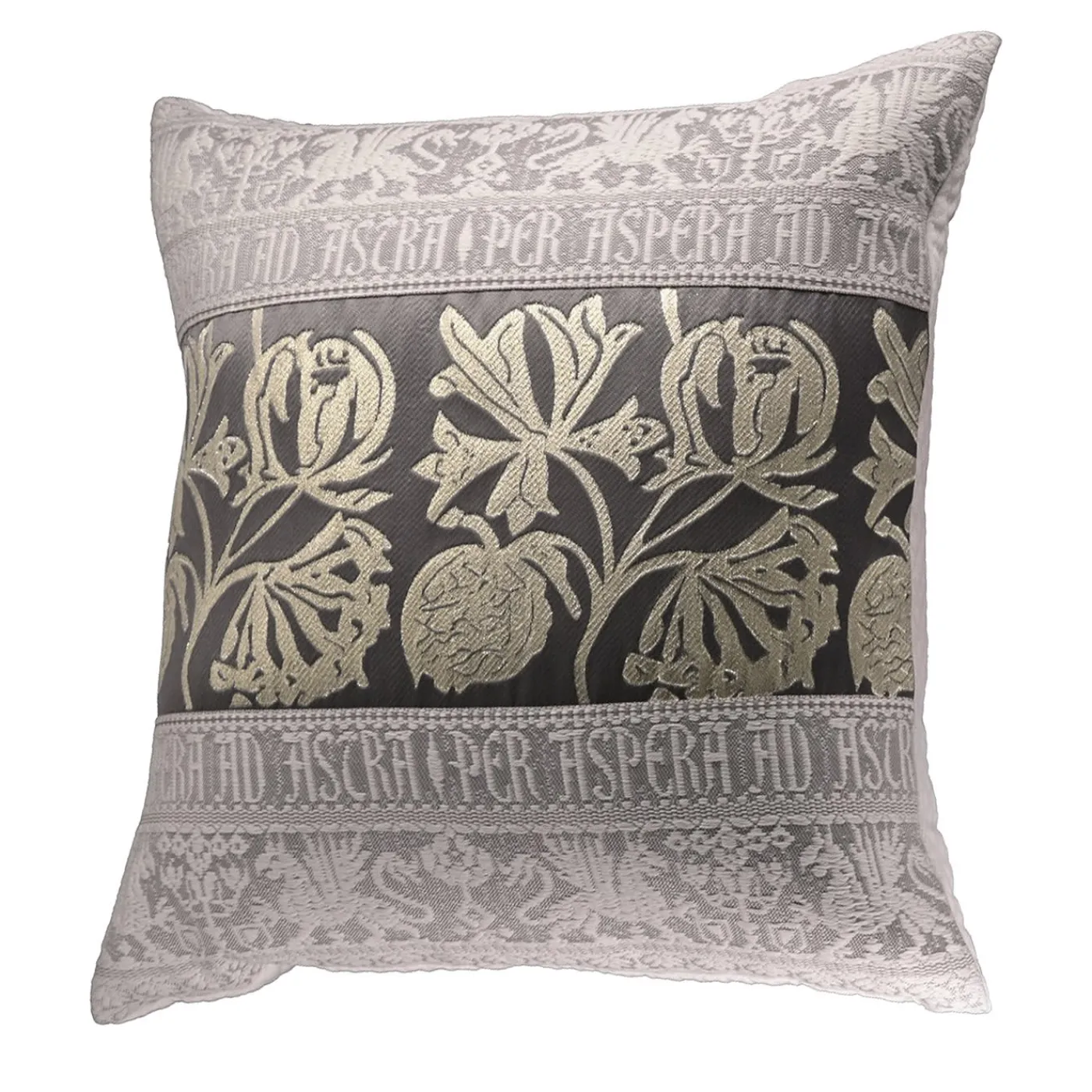 Composto da due fasce realizzate con telai jacquard ottocenteschi, presenta un motivo a grifone e la frase di Seneca “Astra ad Aspera”, realizzata a mano da Marta Cucchia. Il centro è arricchito da una fascia jacquard in fibra ottica e lurex che reinterpreta il motivo originale del melograno dell’Atelier Brozzetti. Le fibre ottiche, sottili come i capelli di un angelo, sono legate tra loro e collegate a una luce LED da 0,1W, alimentata da una batteria USB ricaricabile. In condizioni di scarsa illuminazione, l’effetto è forte e chiaro.