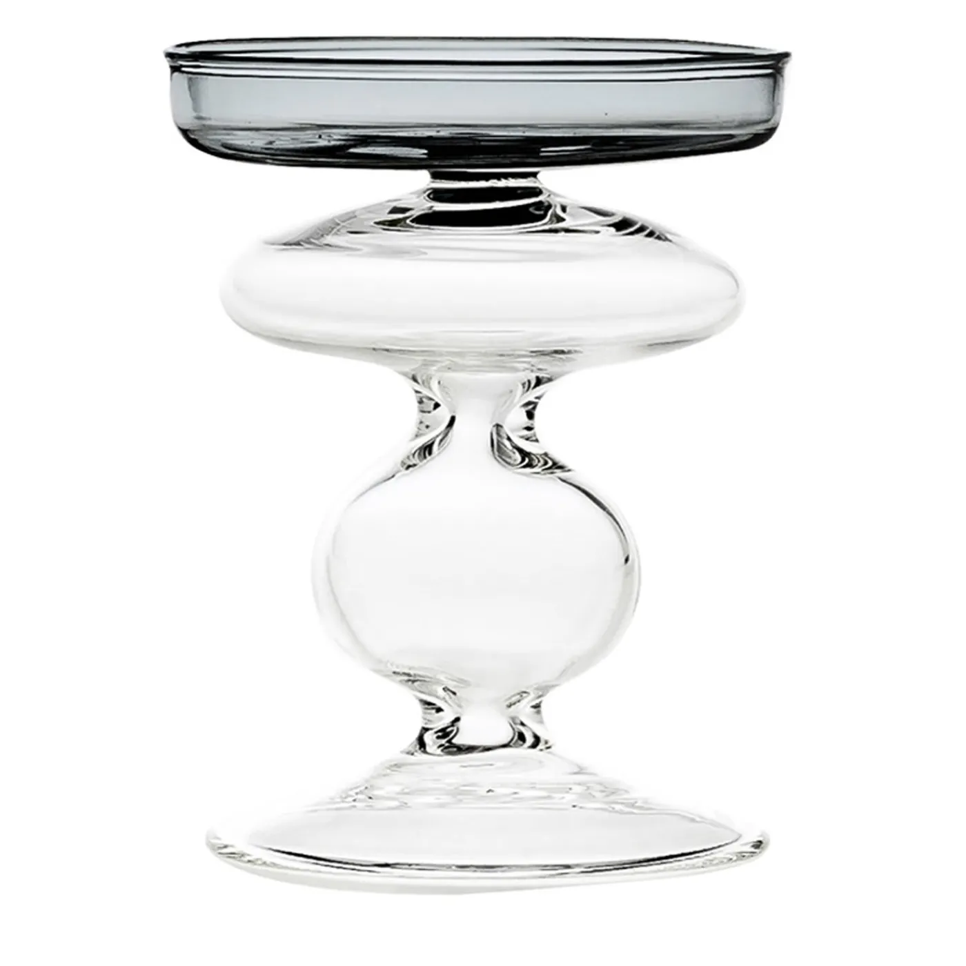 Realizzato a mano a Venezia, questo portacandela è in vetro trasparente che si incurva mellifluamente in forme fluide, mentre l’ampio zoccolo assume una tonalità scura e fumé.