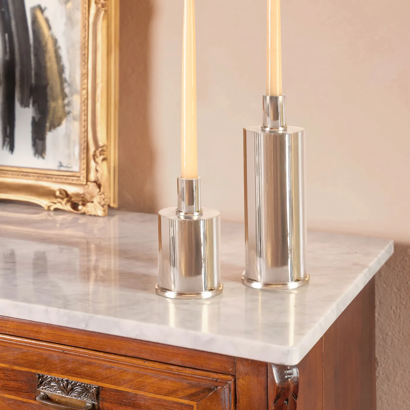 Portacandele raffinato in argento placcato, caratterizzato da linee pulite e essenziali e da un distintivo bordo arrotondato. Progettato per integrarsi armoniosamente in ambienti moderni, classici o minimalisti, questo candeliere basso unisce funzionalità ed estetica, donando a ogni spazio un tocco di stile senza tempo e sofisticata eleganza. La candela non è inclusa.