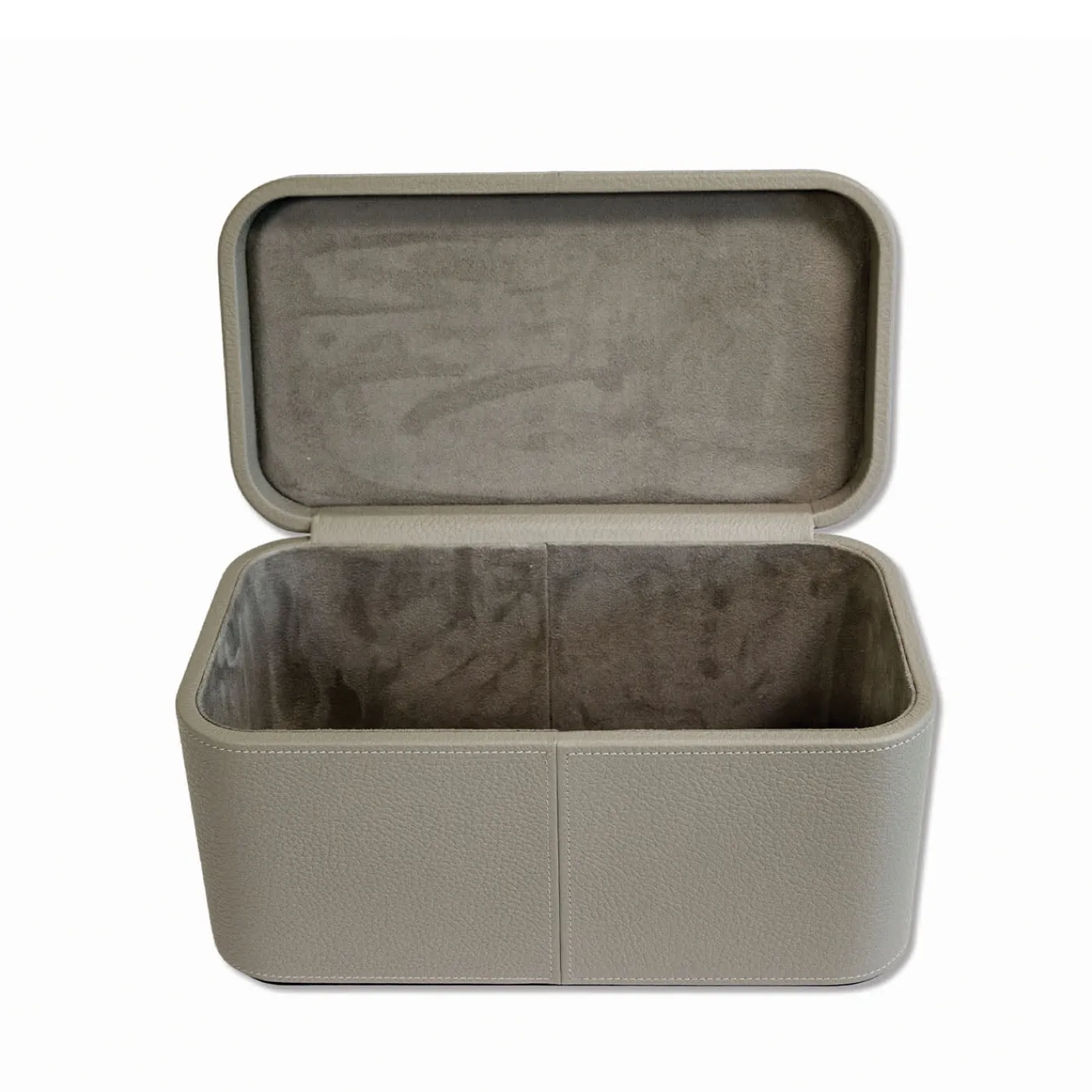 Scatola in legno lavorata a mano e rivestita in morbida vera pelle e microfibra interna. Disponibile in 14 colori diversi. Chiedete al Concierge per ulteriori dettagli.