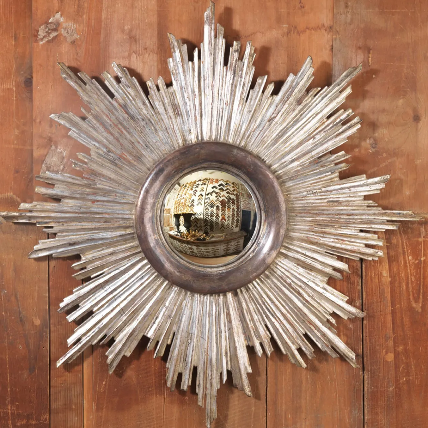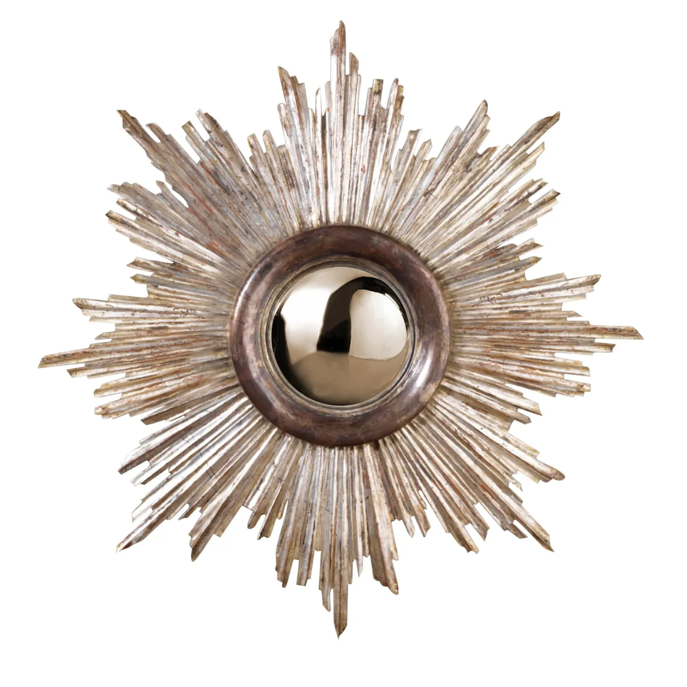 Questo specchio artigianale è una fedele riproduzione di un modello originale a raggiera. Interamente realizzato in legno intagliato a mano e decorato in foglia d’argento da Castorina a Firenze, il pezzo viene fornito con uno specchio convesso su misura.