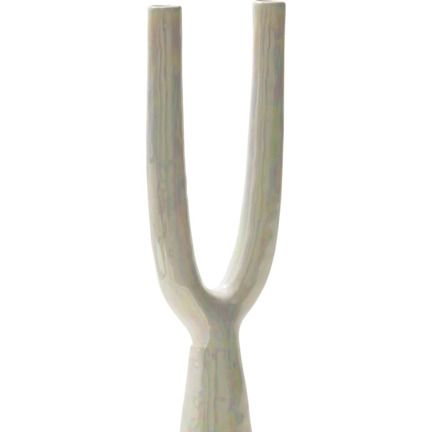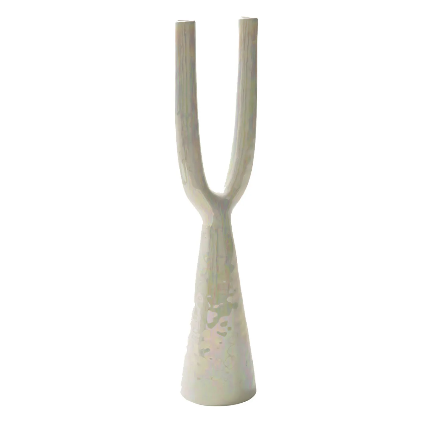 Questo doppio portacandele è un pezzo décor moderno e di classe di Gatti Ceramica. Dopo la prima cottura, l’originale in maiolica viene dipinto a mano in bianco perlato e poi cotto per la seconda volta. Il pezzo viene rifinito con un lustro di madreperla e quindi con una terza cottura, secondo le antiche tecniche di Faenza, capitale della ceramica del Nord Italia.