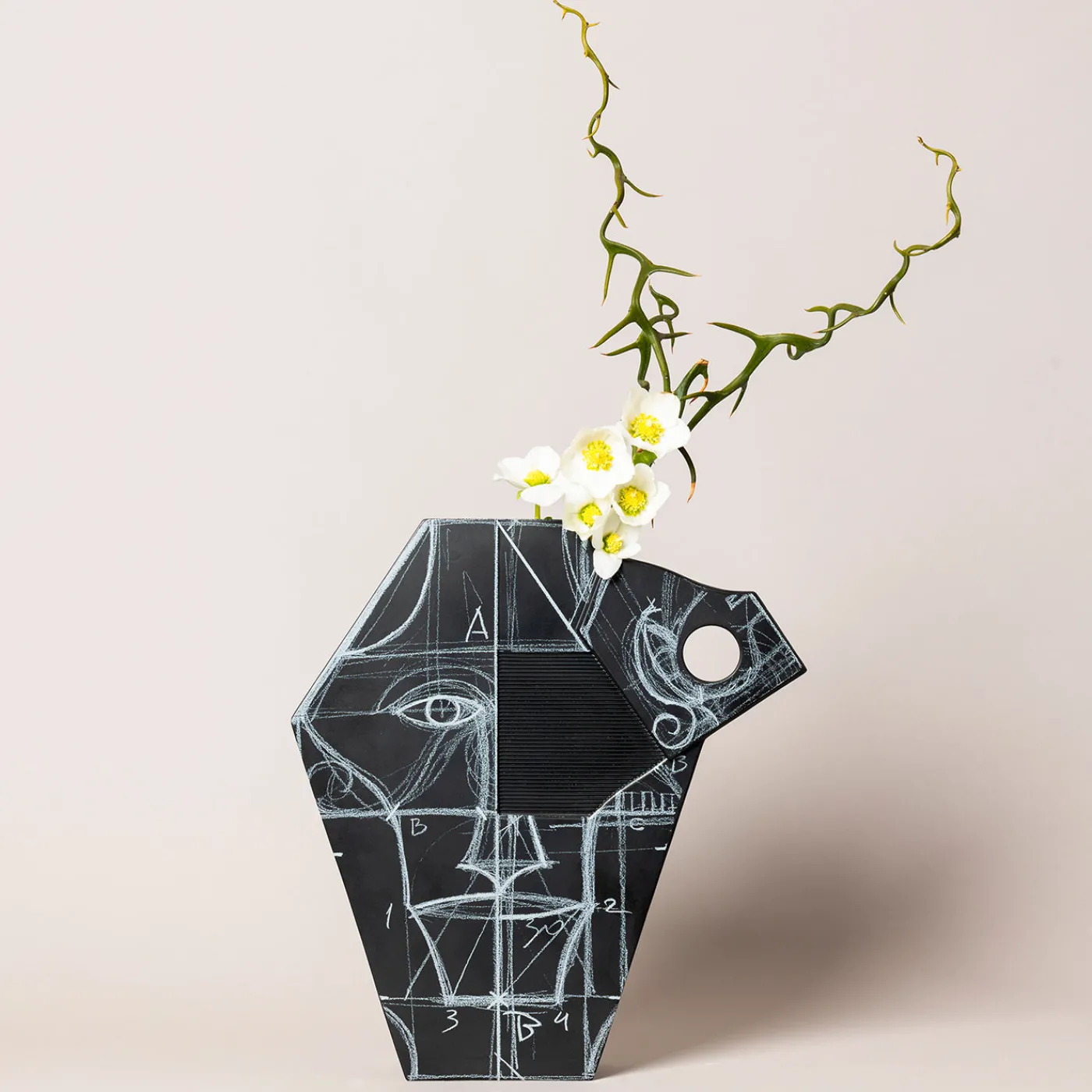 Ulisse fa parte di una collezione unica di dieci vasi scultorei progettati da Mimmo Paladino, ispirati a figure iconiche dell’Iliade e dell’Odissea. Questo pezzo reinterpreta la figura dell’eroe errante attraverso una forma scultorea distintiva, animata da fitte linee grafiche e motivi intricati che richiamano i percorsi labirintici dei suoi viaggi. La superficie smaltata in nero, arricchita da dettagli serigrafici bianchi, evoca memoria e identità, dando vita a un dialogo continuo tra presenza e assenza. Il vaso Ulisse fonde simbolismo mitologico con espressione artistica contemporanea in un oggetto decorativo unico ed evocativo.