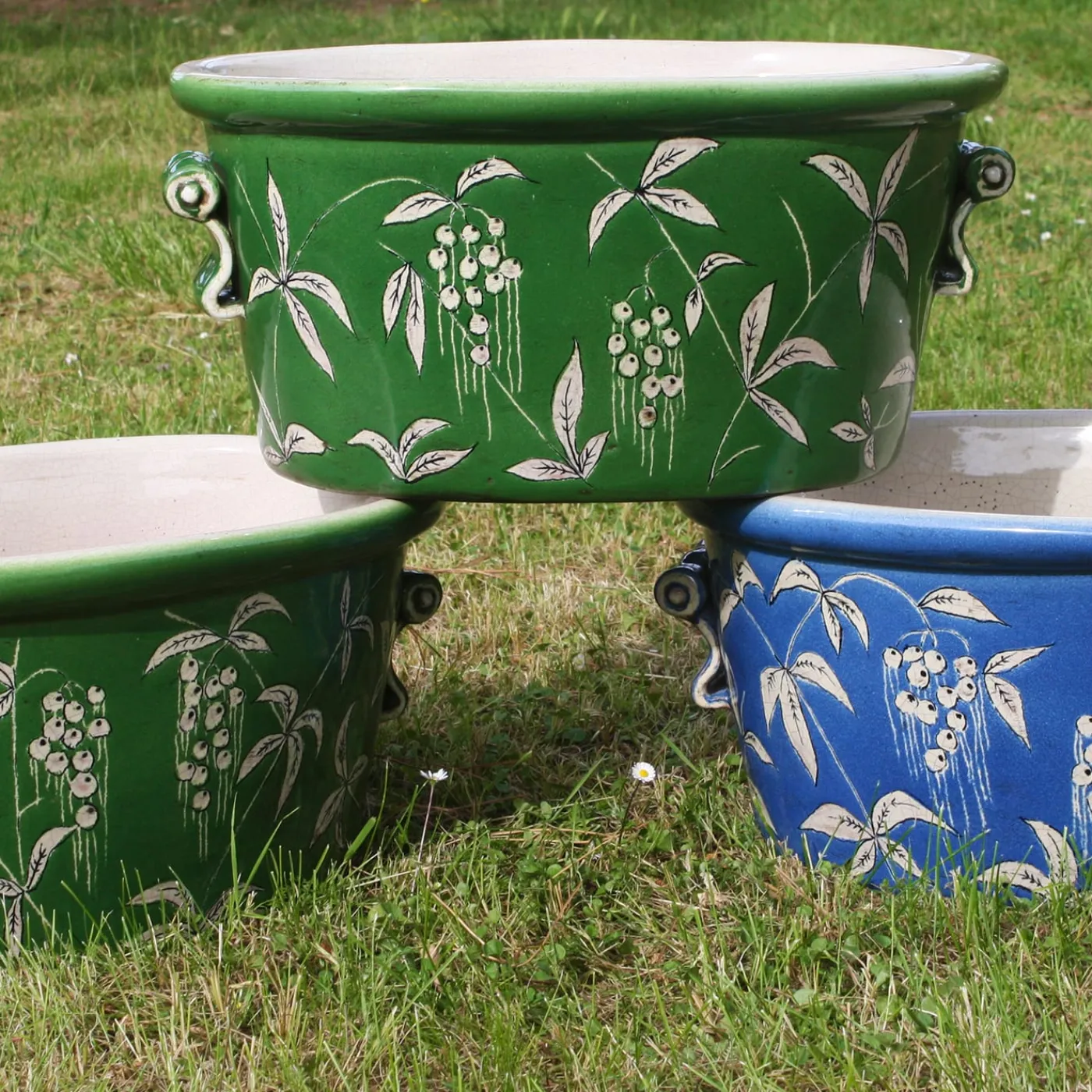 Perfetto per ospitare profumate piante di basilico o fiori colorati su balconi soleggiati, questo cachepot abbina la tipica eleganza della ceramica a un’abile lavorazione artigianale. Ai lati sono applicati manici sinuosi e arricciati, che aggiungono un tocco di funzionalità al corpo liscio a base ovale sigillato da un bordo sporgente. Una smaltatura in una brillante tonalità di blu cielo sottolinea l’esterno, solo velato da un delicato motivo in stile Devonshire.