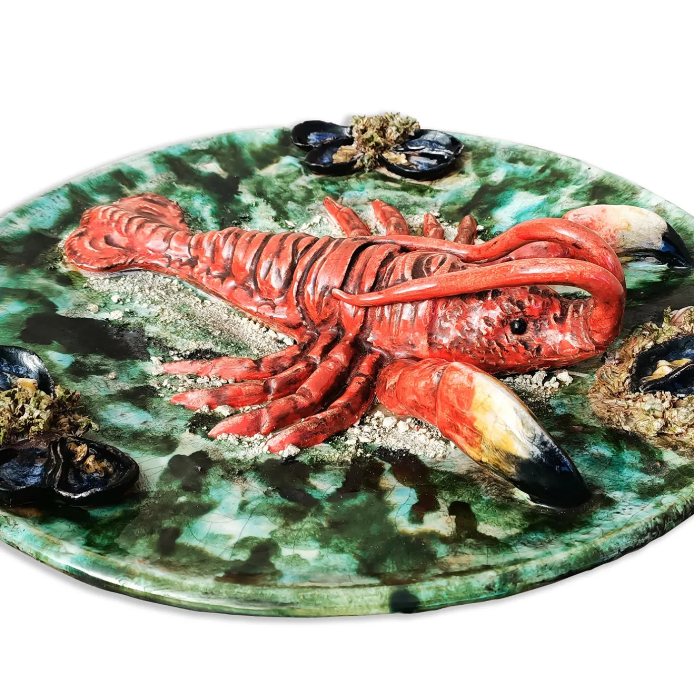 Ispirato al talentuoso ceramista francese del 1500 Bernard Palissy, questo accattivante piatto da parete è realizzato in ceramica e presenta il disegno di una grande aragosta e di conchiglie in rilievo. Ideale da esporre in cucina o in sala da pranzo, questo pezzo aggiungerà carattere e colore a qualsiasi arredamento contemporaneo.