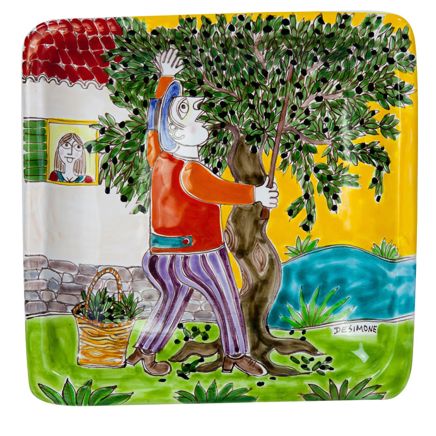 Caratterizzato da una deliziosa scena dipinta a mano di un contadino che raccoglie olive, il piatto decorativo DS Square, realizzato a mano, è un pezzo pregiato di artigianato ceramico. Un foro sul retro consente di fissare il piatto 20 x 20 cm alla parete, se lo si desidera, e i colori vivaci ravvivano l’ambiente, abbinandosi sia agli arredi moderni che a quelli classici.