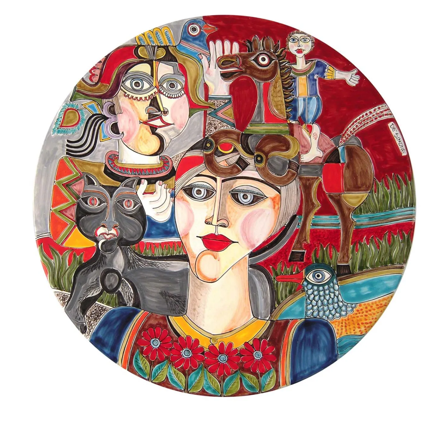Questo piatto unico in ceramica, realizzato e dipinto a mano, appartiene alla collezione DS del marchio Ceramiche de Simone. Oggi l’obiettivo dell’azienda è quello di dare continuità allo storico marchio mantenendo l’attenzione sulla creatività. Caratterizzato da una donna con gatto dipinta in stile picassiano, questo pezzo può essere appeso a parete come quadro decorativo.