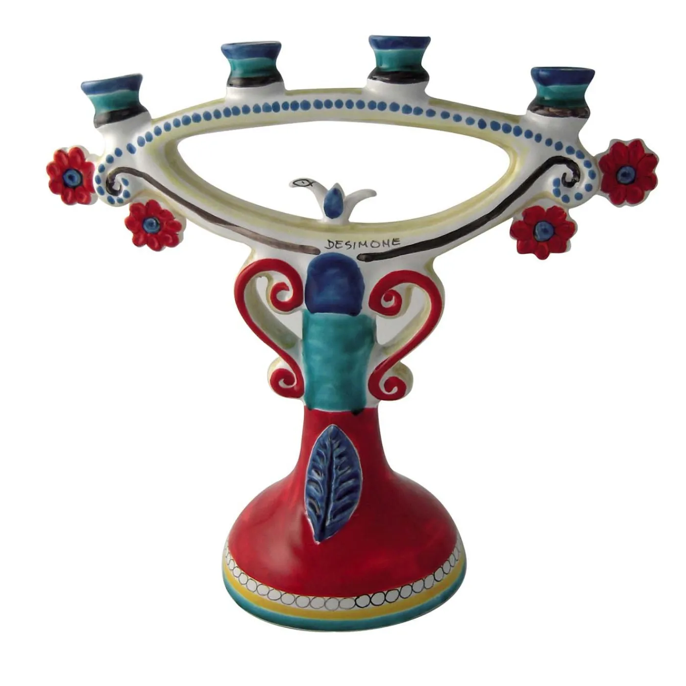 Aggiungete un tocco di eleganza senza tempo alla vostra casa con questo portacandele a quattro bracci in ceramica di argilla bianca dipinta a mano con decorazioni rosse, blu e gialle e dettagli floreali rossi. Le Ceramiche de Simone sono interamente realizzate a mano, create e disegnate dai nostri artisti, pertanto le occasionali differenze e imperfezioni sono segno dell’unicità ed esclusività dei prodotti.