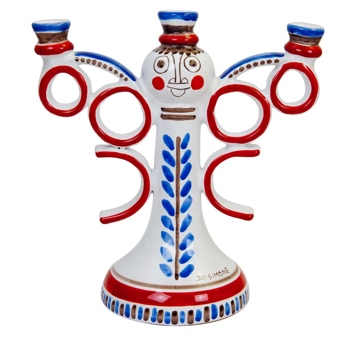 Questo portacandele a tre bracci in argilla bianca di Ceramiche de Simone ha un design giocoso che lo rende perfetto per ravvivare un ambiente minimalista. Dipinto a mano con decorazioni rosse e blu, questo pezzo è arricchito da dettagli a forma di cappello e circolari e da un volto umano dipinto sulla parte superiore sferica del candeliere.