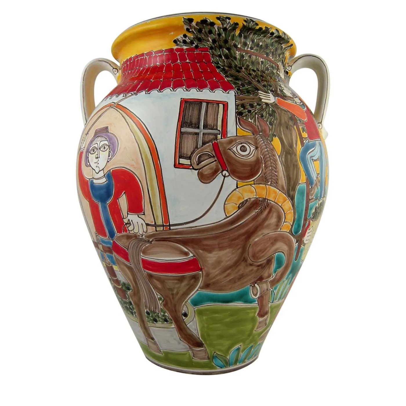 Caratterizzato dalla tradizionale rappresentazione di una raccolta di olive, questo vaso in ceramica è realizzato e dipinto a mano dagli artigiani De Simone. Il disegno, dai colori vivaci, si ispira alle tradizioni artistiche e ai colori della Sicilia, rendendolo un perfetto omaggio alla cultura dell’isola. Ogni vaso è firmato e venduto con un certificato di autenticità.