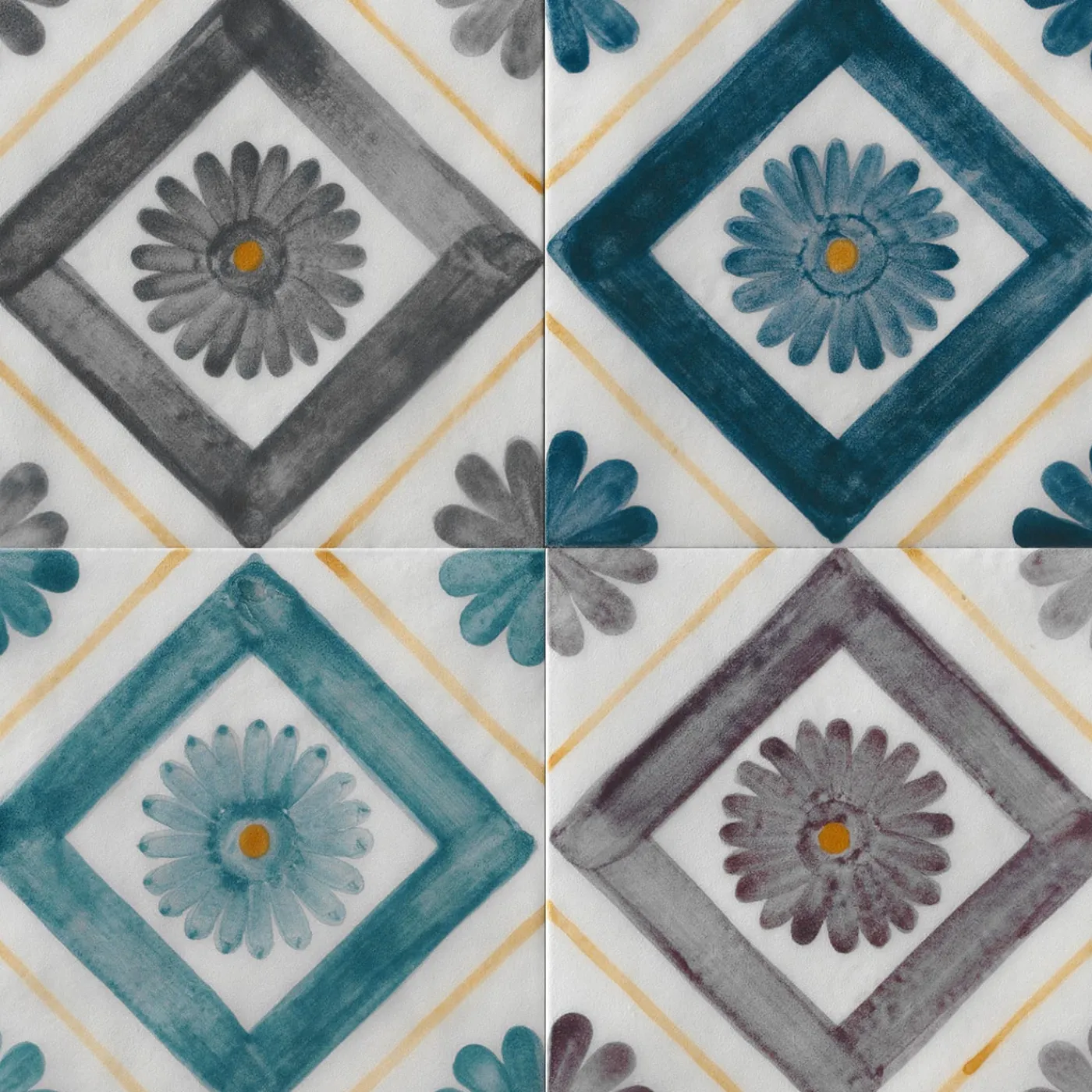 Una combinazione di semplici linee geometriche e margherite definisce l’allure poetica di questo set di ceramica composto da 24 piastrelle quadrate destinate al rivestimento. Dipinta a mano con accurate pennellate da esperti artigiani con smalti verde menta e senape, ogni piastrella si distingue per le singolari sfumature che ne sottolineano ulteriormente il valore artistico. Per ulteriori opzioni di colore, consultare il catalogo Artemest.