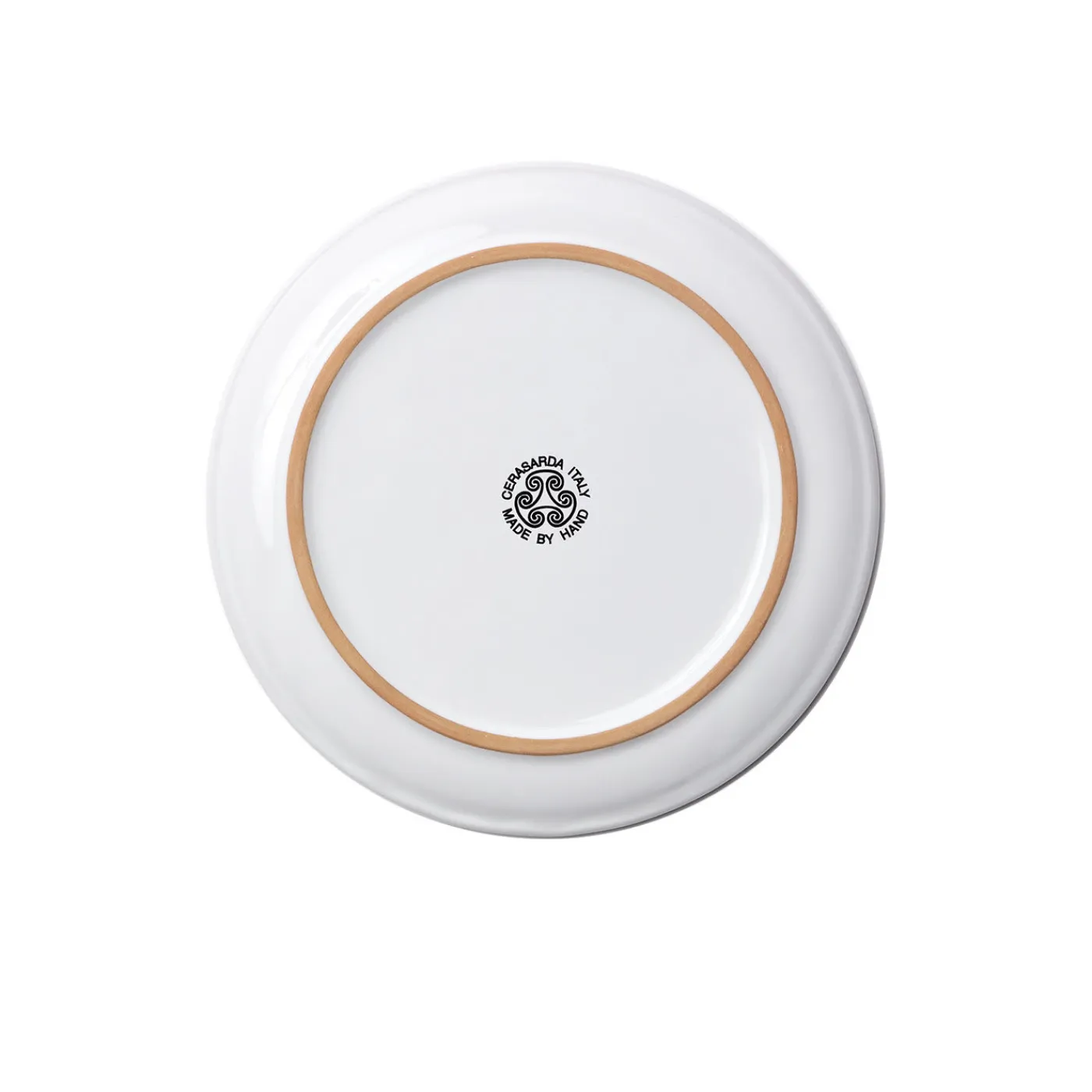 Parte di una serie di piatti artigianali disegnati da Giorgio Bosi, questo pezzo è magistralmente decorato a mano da esperti artigiani con la tecnica del graffito, che graffiano la superficie di terracotta fatta a mano per aggiungere smalti dai colori vivaci rosso, arancione e giallo. La conchiglia che ne risulta è una singolare opera d’arte decorativa.