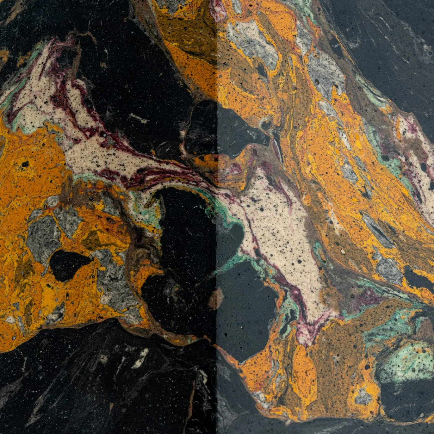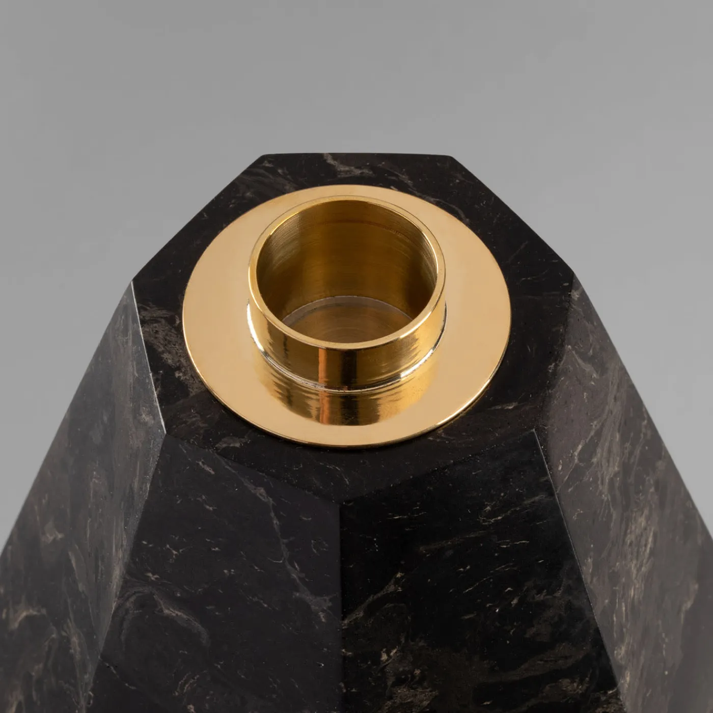 Candelabro a base ottagonale realizzato in Scagliola Carpigiana. Lavorato con colla e pigmenti naturali, il gesso è modellato per imitare le caratteristiche del marmo. La sede della candela è in ottone lucido con un diametro di 3 cm. La texture del disegno si stacca da un fondo nero con toni ocra, verdi e bianchi interrotti da una vena bordeaux secca. Pezzo unico
