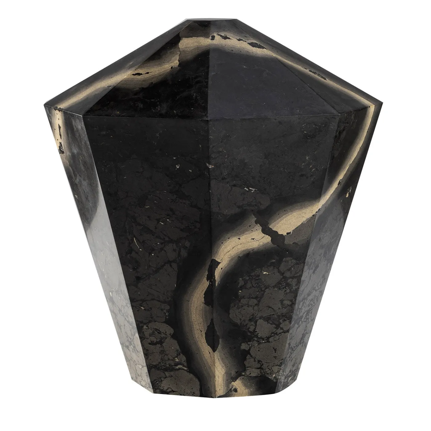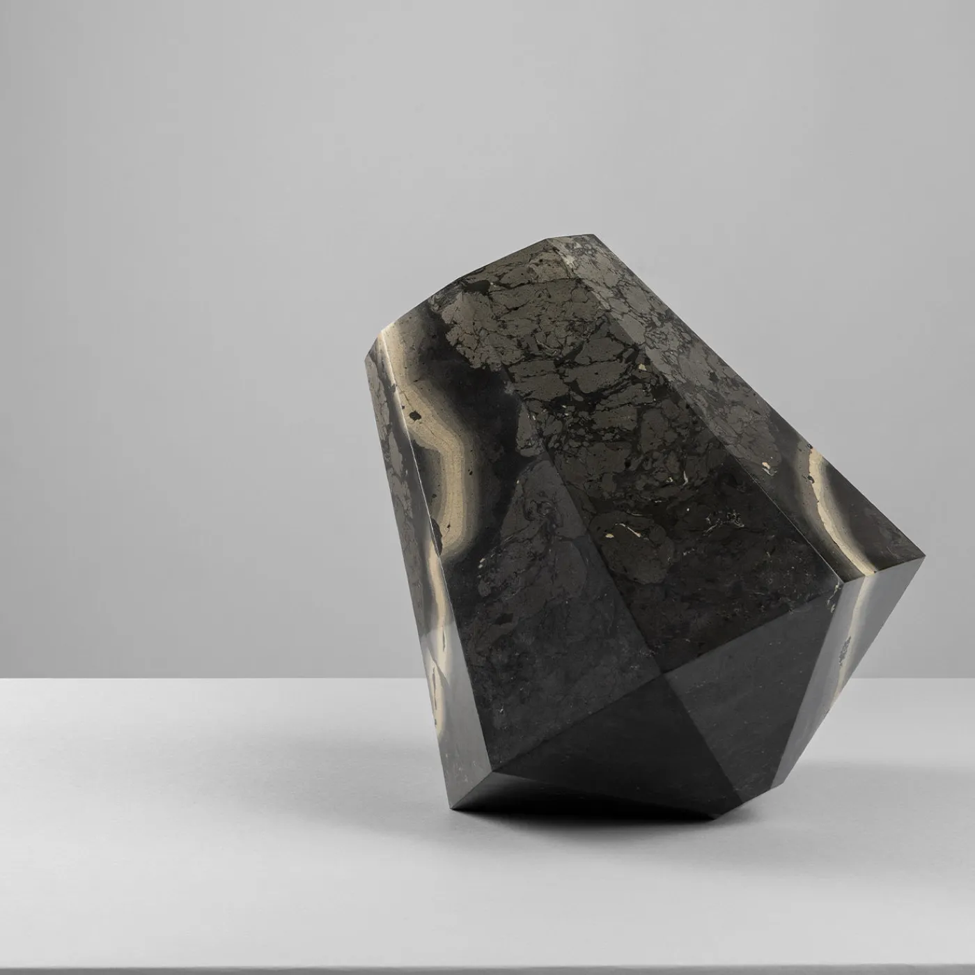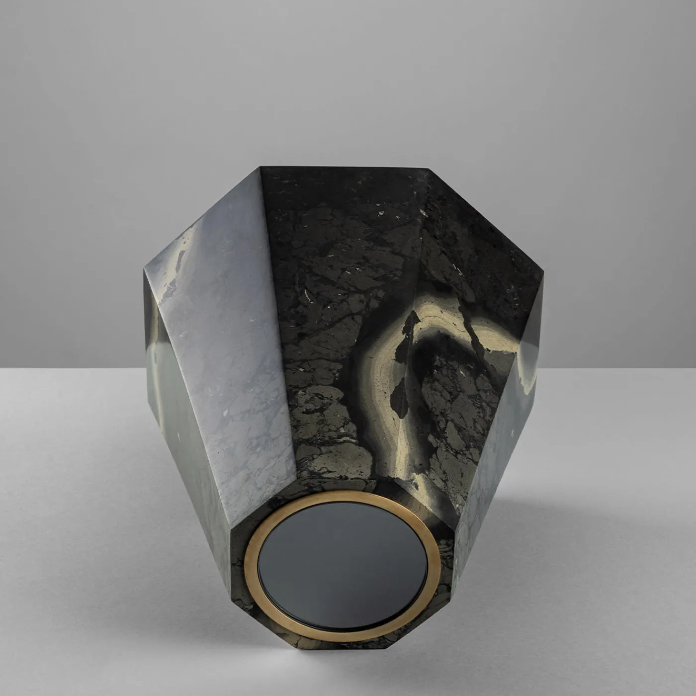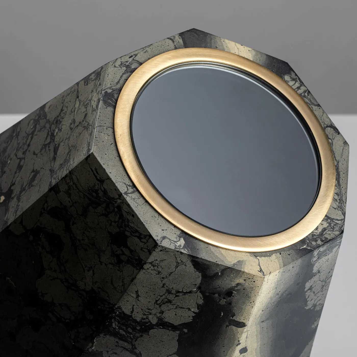 Il Prisma ottagonale in Scagliola è realizzato interamente a mano secondo la tradizione carpigiana. Lavorato con colla e pigmenti naturali, il gesso viene modellato per imitare i tratti del marmo. Lo specchio scuro è incastonato in una cornice di ottone in accordo con i toni dell’impasto. Questo specchio da tavolo è dedicato ad Alfonso Bialetti, creatore della famosa Moka; la forma ottagonale del prisma riprende il manico in bachelite della caffettiera. Pezzo unico.