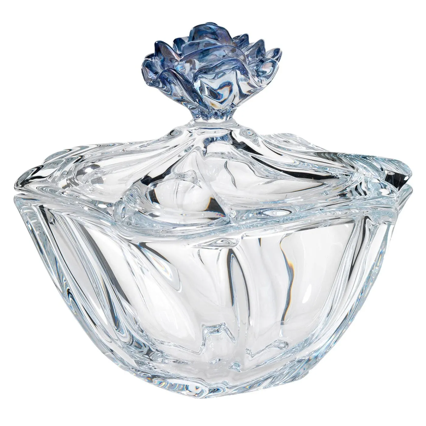 Un meraviglioso disegno in rilievo, unito a una sorprendente lucentezza e trasparenza, contraddistingue questa raffinata scatola in vetro della collezione Milano. Definita da linee sinuose e dinamiche, la sua silhouette è completata da un coperchio coordinato alla cui sommità si trova un terminale azzurro a forma di fiore sbocciato che infonde al pezzo pura femminilità. Ideale per raccogliere caramelle o gioielli.