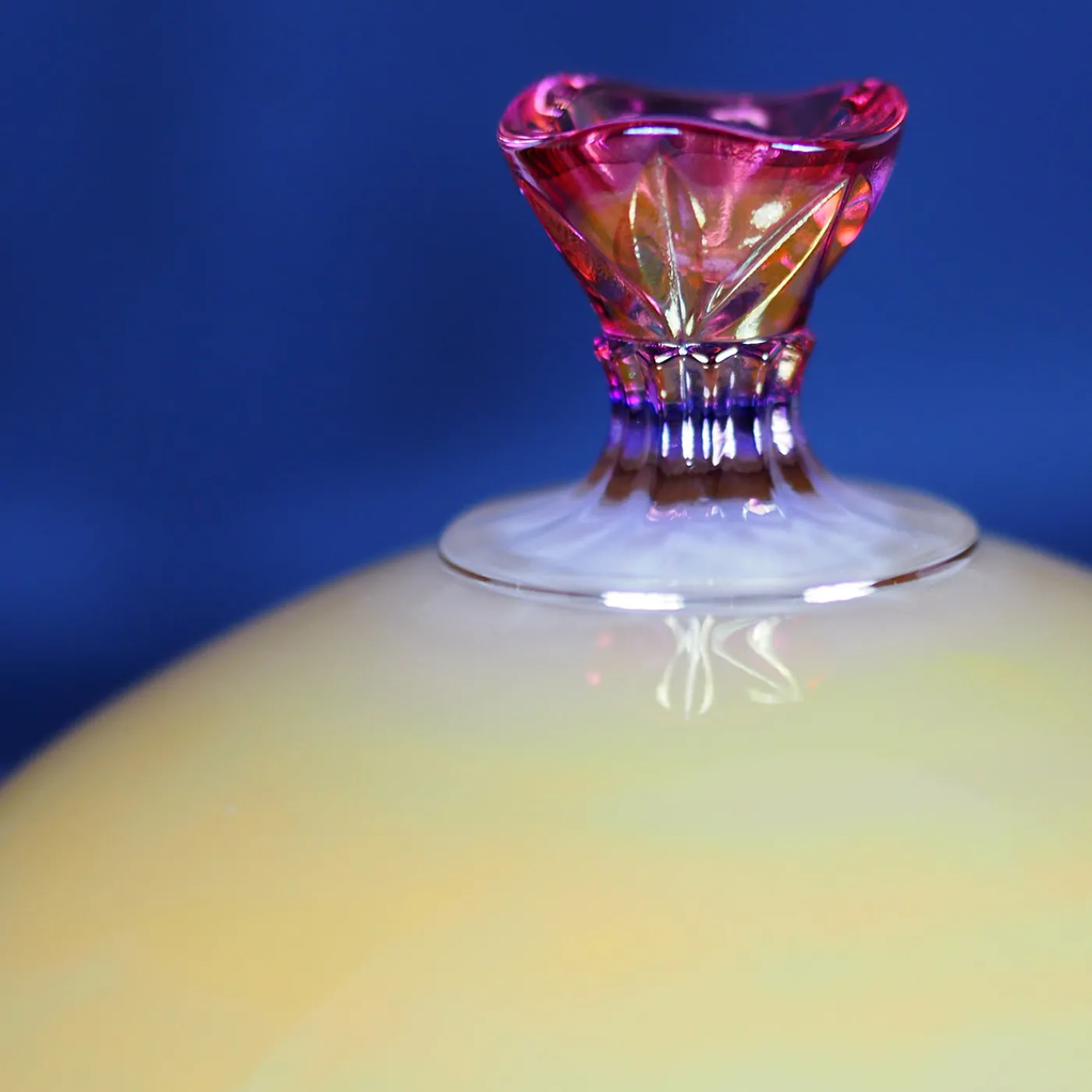 Questa squisita scatola è realizzata interamente a mano in cristallo. Il contenitore del pezzo è di un suggestivo colore rosa, mentre il coperchio è di un colore giallo accentuato da un elemento rosa nella parte superiore.