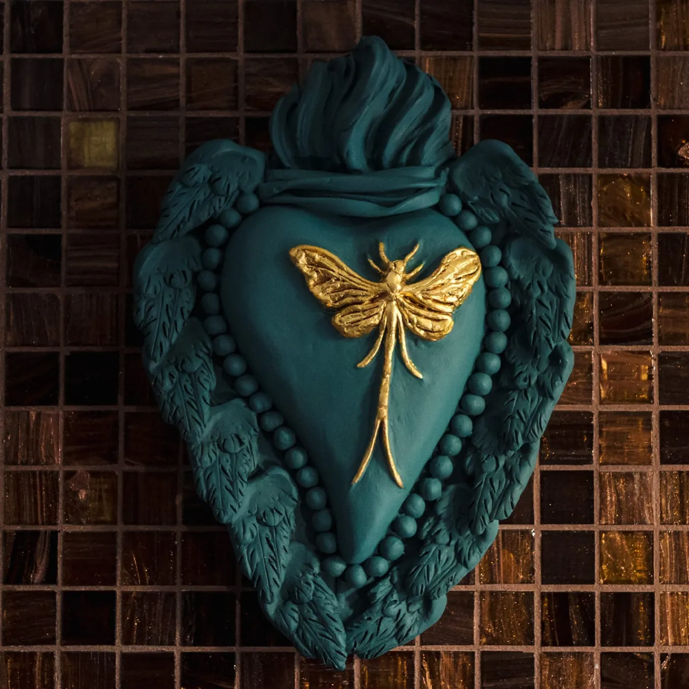 Splendido e poetico omaggio all’amore e alla primavera, questo magnifico cuore in ceramica è un’abile dimostrazione di maestria artigianale. Arricchito da dettagli preziosi, presenta al centro una Mayfly in foglia d’oro. Interamente laccato in un colore verde smeraldo opaco, è incorniciato da un filo di perle e da piumose ali d’angelo.