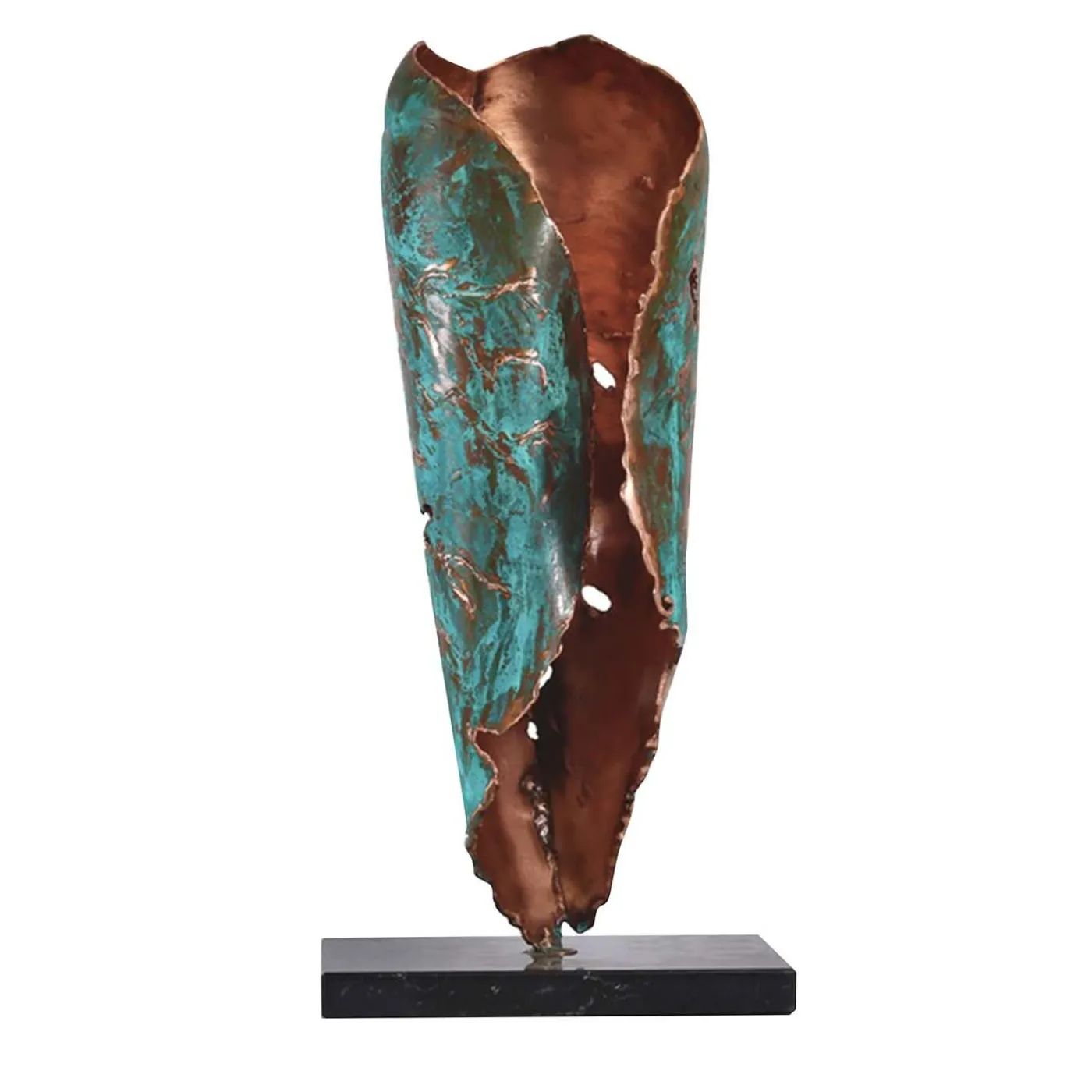 Un nuovo germoglio fa capolino da sotto un mucchio di foglie cadute. Il ciclo vitale della natura continua, in tutti i suoi magnifici colori. Questa statua è realizzata in rame riciclato, lavorato a mano e completato con trattamenti naturali per esaltare la tonalità verde. Un pezzo sostenibile, realizzato interamente a mano.