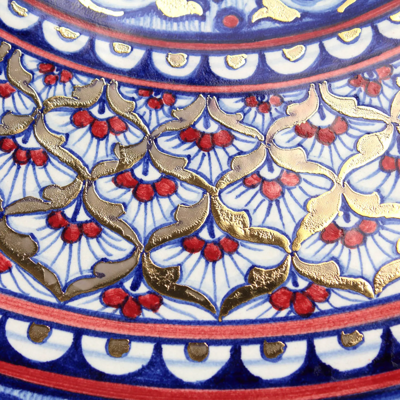 Il piatto Moorish Gold è realizzato in maiolica e decorato a mano in una sorprendente combinazione di blu e rosso intenso. Il design ricco di dettagli trae ispirazione dall’arte moresca, con motivi vegetali a spirale e forme a cuore lungo il bordo esterno, mentre la fascia interna presenta eleganti decorazioni floreali incorniciate da un motivo radiale a embricazioni. Accenti in lustro d’oro applicati con tecnica di terza cottura valorizzano la composizione, culminando in una figura fitomorfa adornata da foglie dorate e fiori rossi che si estende lungo la circonferenza. Ogni pezzo, prodotto in edizione limitata, è certificato e firmato sul retro, e può presentare leggere variazioni che ne attestano l’autenticità artigianale.
