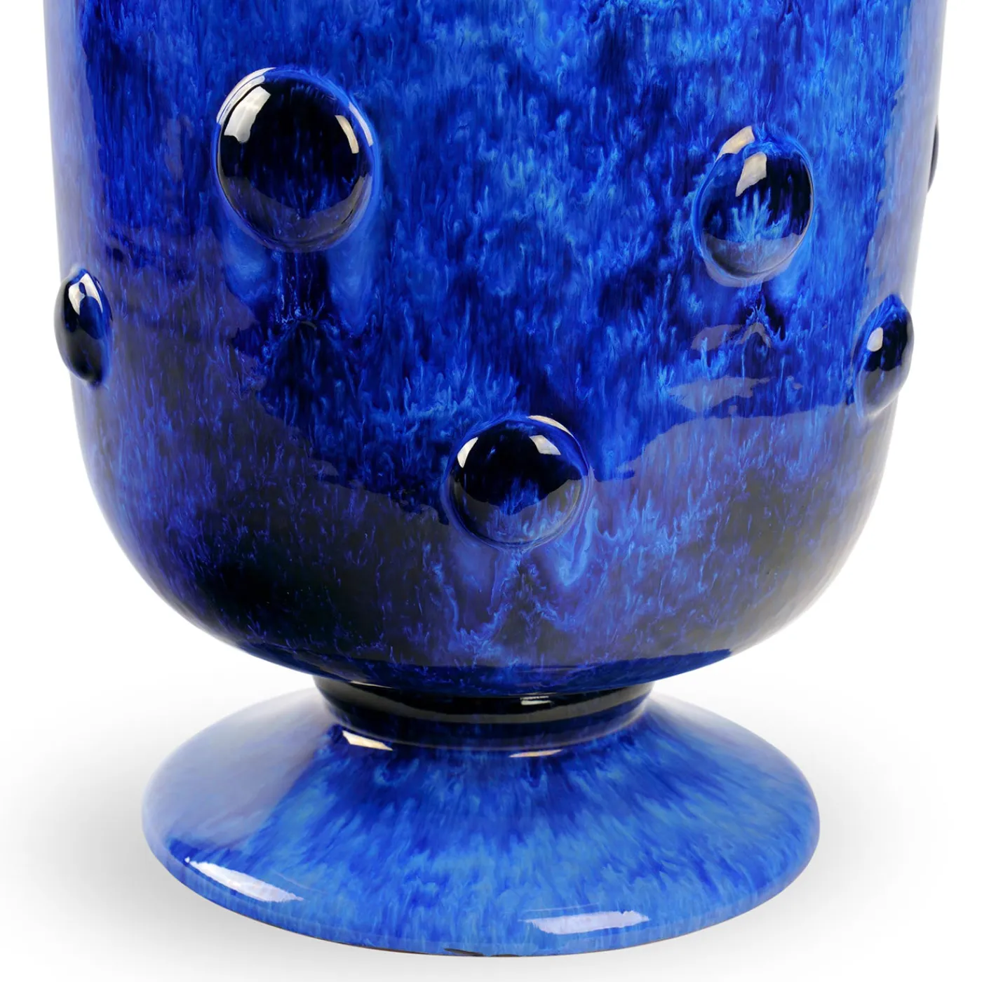 Il vaso Abisso si caratterizza per una profonda finitura blu lucida a specchio, arricchita da rilievi tattili a bolle che conferiscono una texture organica. La forma, tornita a mano, presenta scanalature delicate e un raffinato bordo svasato, che donano profondità e carattere al pezzo. Ogni esemplare mostra variazioni uniche di colore e dettaglio, testimonianza dell’eccellenza artigianale, e rappresenta un accento audace e originale per qualsiasi ambiente interno.