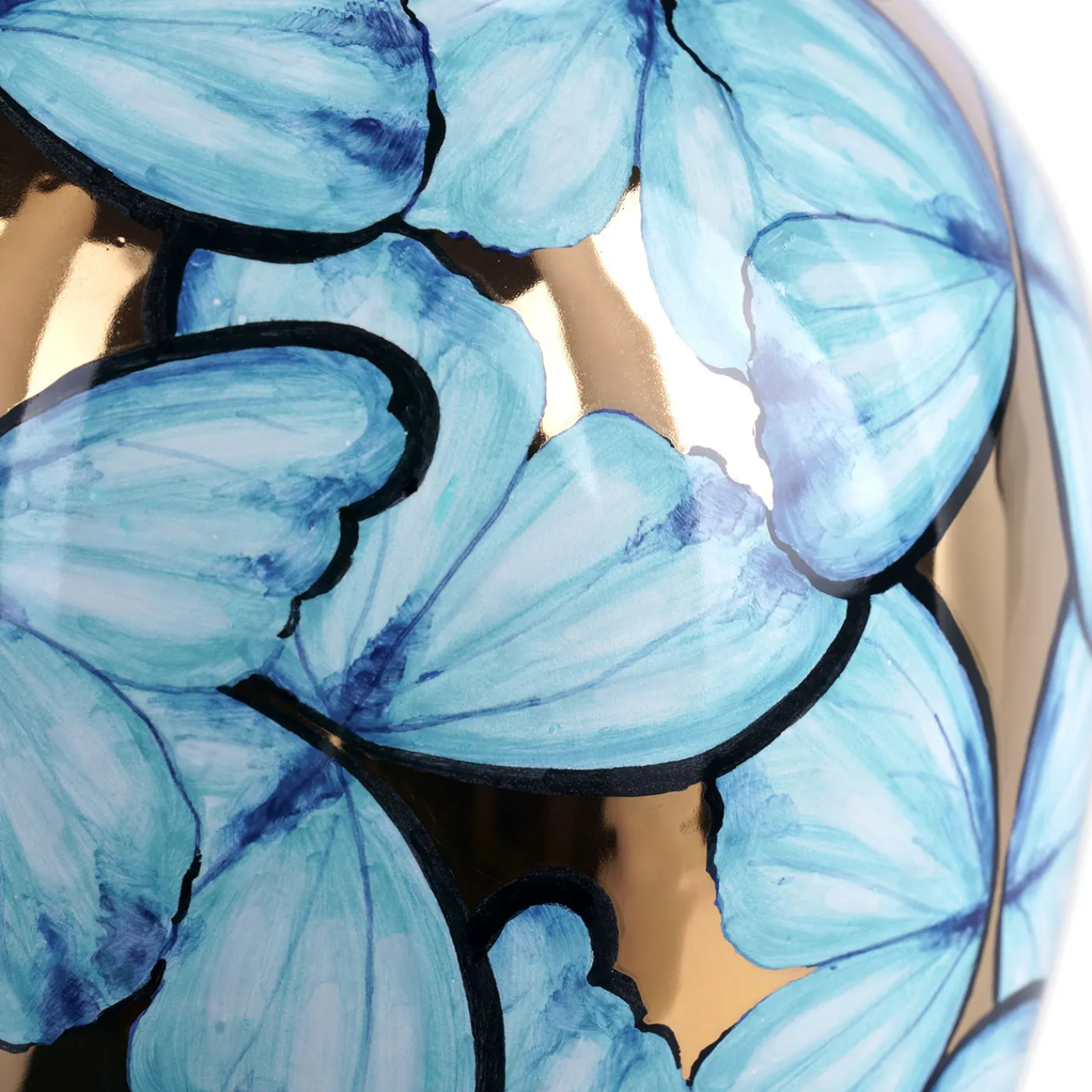 Il vaso Petalouda si distingue per la sua superficie radiosa placcata in oro 24 kt, decorata con farfalle blu dipinte a mano che simboleggiano gioia e trasformazione. Realizzato con la tecnica del lustro a terza cottura, vanta una lucentezza dorata che esalta i dettagli del design. Parte di un’edizione limitata di soli 50 pezzi, ogni esemplare presenta leggere variazioni che ne sottolineano l’unicità artigianale. Un raffinato oggetto decorativo che unisce eleganza classica e arte contemporanea.