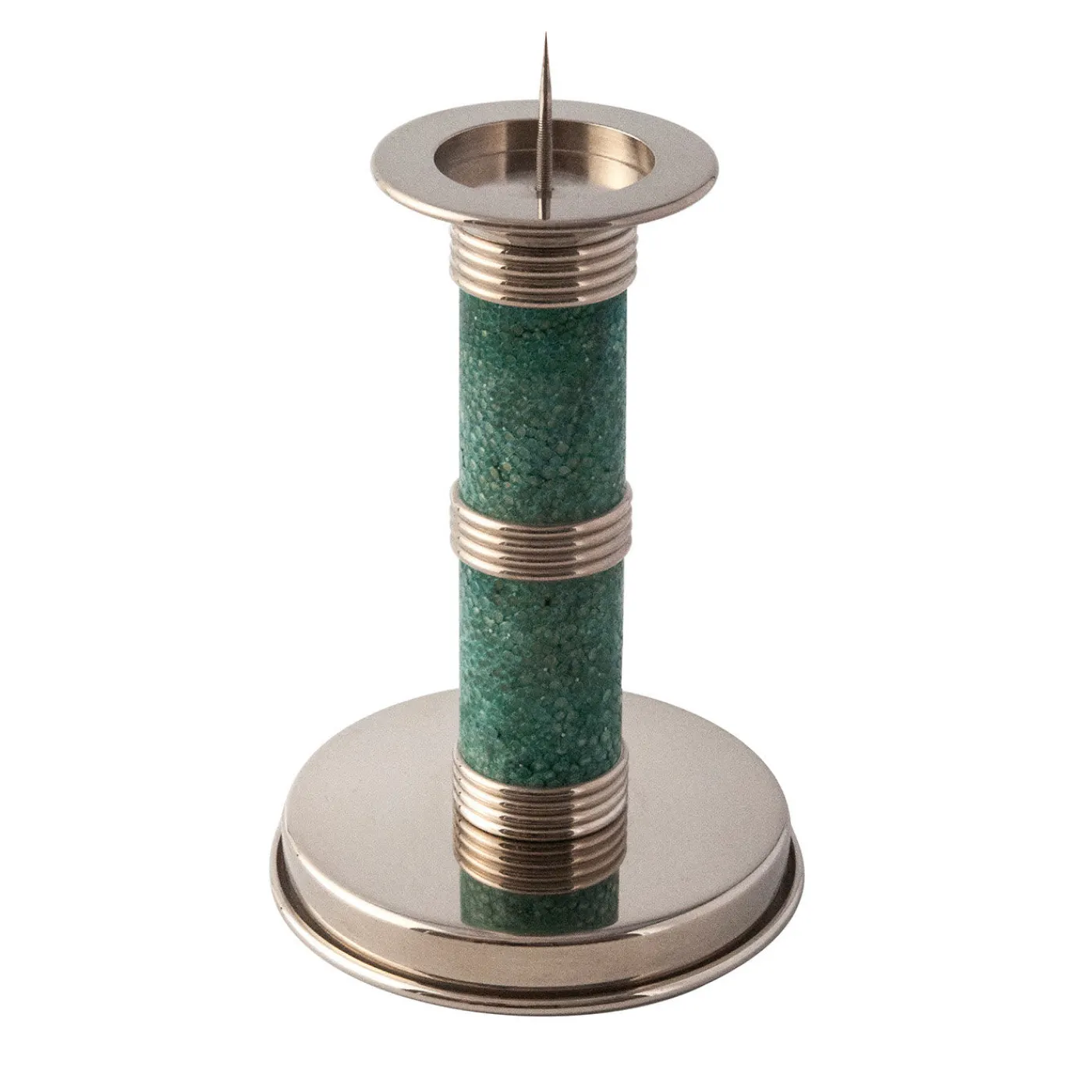 Sofisticato e funzionale, questo splendido candeliere è un must per una casa moderna. Disegnato e realizzato a mano da Nino Basso per la collezione Galucharme, presenta una struttura in ottone nichelato lucido con base rotonda (Ø 11 cm) e raccogli gocce (Ø 6,5 cm). Il fusto cilindrico è impreziosito da tre anelli scanalati e avvolto in vero zigrino in una moderna tonalità verde smeraldo. Il libretto di istruzioni per la cura è incluso nella scatola personalizzata pronta per essere regalata.