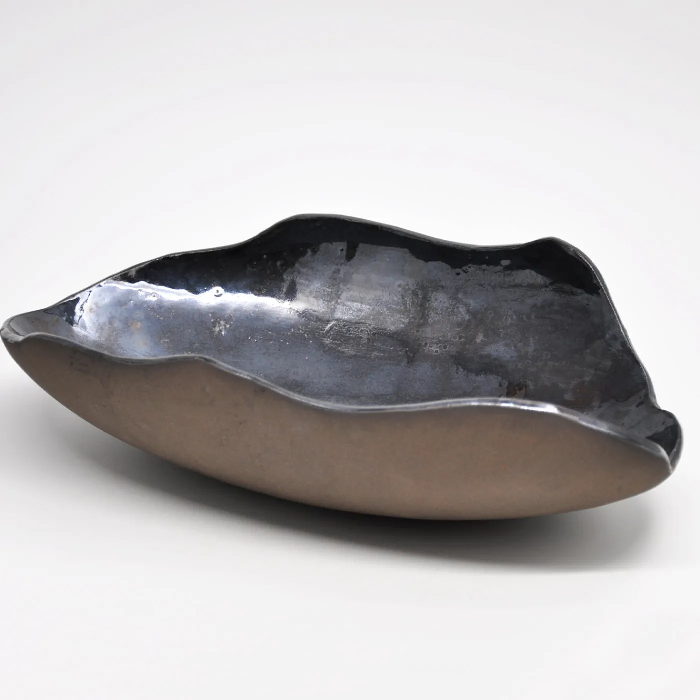 Questo centrotavola in ceramica della serie “Notte Stellata” presenta una forma organica e scultorea con cavità allungata e bordi ondulati. L’interno mostra una superficie lucida e iridescente con riflessi metallici e delicate tonalità brunite a contrasto, che evocano la profondità di un cielo stellato. L’esterno opaco e tattile crea un morbido contrasto, aggiungendo un tocco di sobria eleganza. Progettato per ambienti contemporanei, include confezione, certificato di autenticità e istruzioni per la cura.