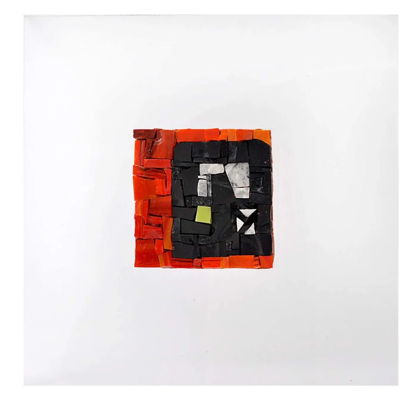 Pavimenti romani e mosaici bizantini riappaiono in chiave contemporanea in questo tableau di mosaico fatto a mano da Nino Basso. Le tessere di smalto veneziano di forma irregolare, nei colori rosso, nero e giallo, sono utilizzate dall’artista per creare un quadrato racchiuso nelle linee pulite e trasparenti della cornice in cristallo acrilico del tavolo.
