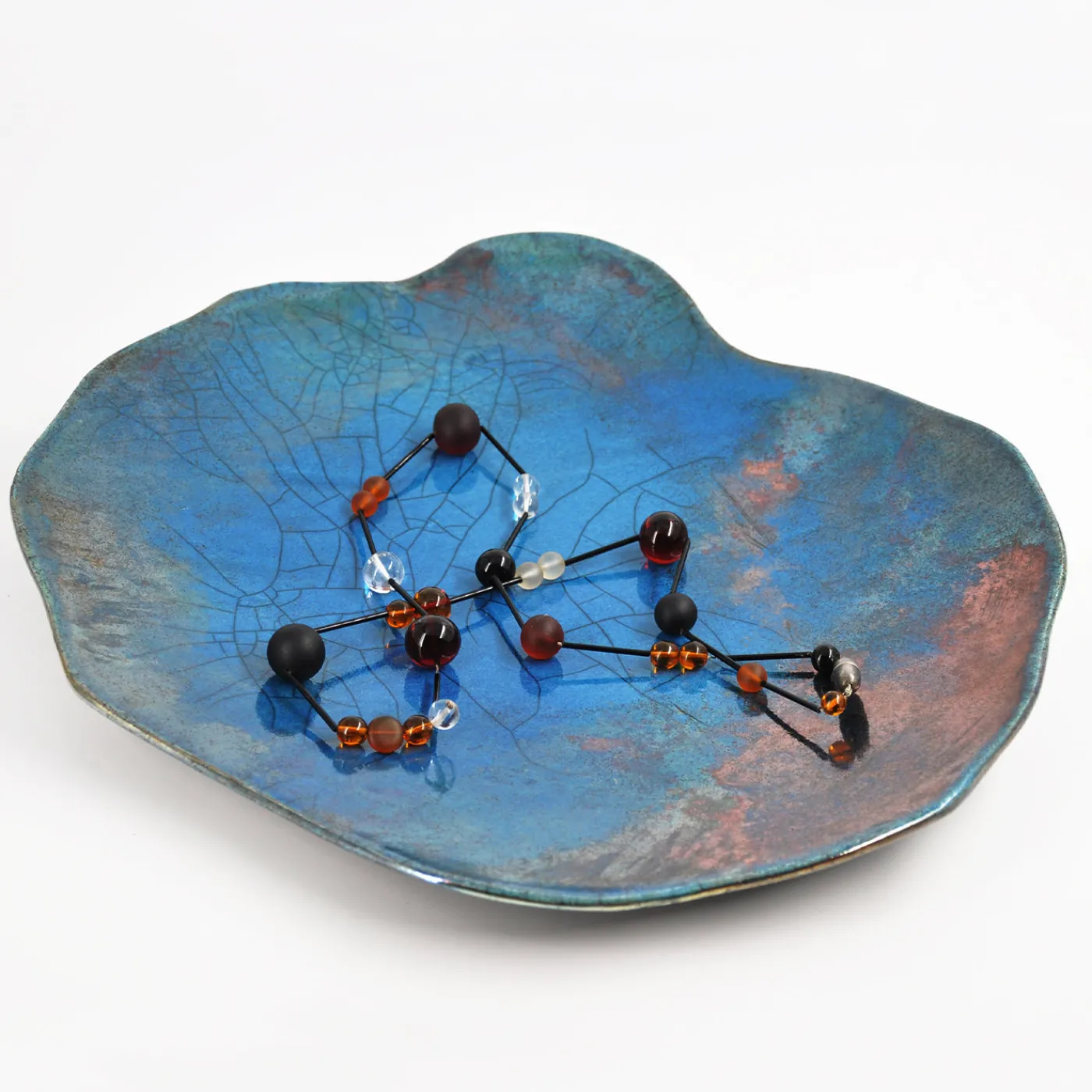 Un piatto scultoreo in ceramica dalla silhouette organica e irregolare, realizzato con la tradizionale tecnica giapponese del raku. Con un diametro di 37 cm, presenta vivaci tonalità di blu intenso arricchite da accenti iridescenti ramati e una caratteristica finitura craquelé che dona texture e interesse visivo unici. Adatto come centrotavola d’effetto, portagioie o elemento decorativo da parete. Include confezione, certificato di autenticità e istruzioni per la cura.