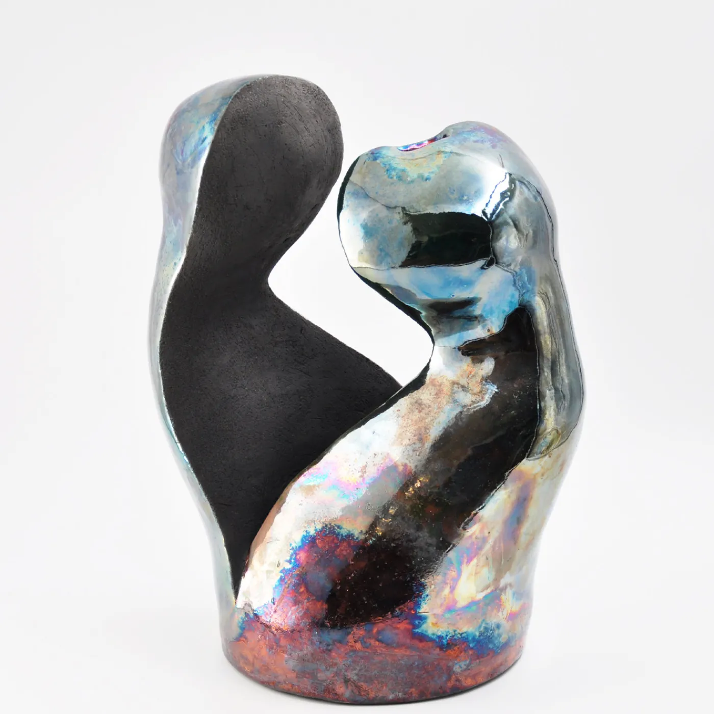 Intesa è una scultura ceramica contemporanea creata utilizzando la tecnica della coiling e rifinita con il tradizionale processo giapponese raku. Alta 42 cm, questo pezzo unico presenta due forme antropomorfe adagiate in un gesto sospeso, simboleggiando una profonda connessione silenziosa. La superficie iridescente, ottenuta attraverso la cottura a riduzione diretta, riflette tonalità cangianti con la luce, contrastando in modo sorprendente con l’interno nero opaco per esaltare il gioco tra luce, ombra e presenza. Include imballaggio, certificato di autenticità e istruzioni per la cura. Pezzo unico.