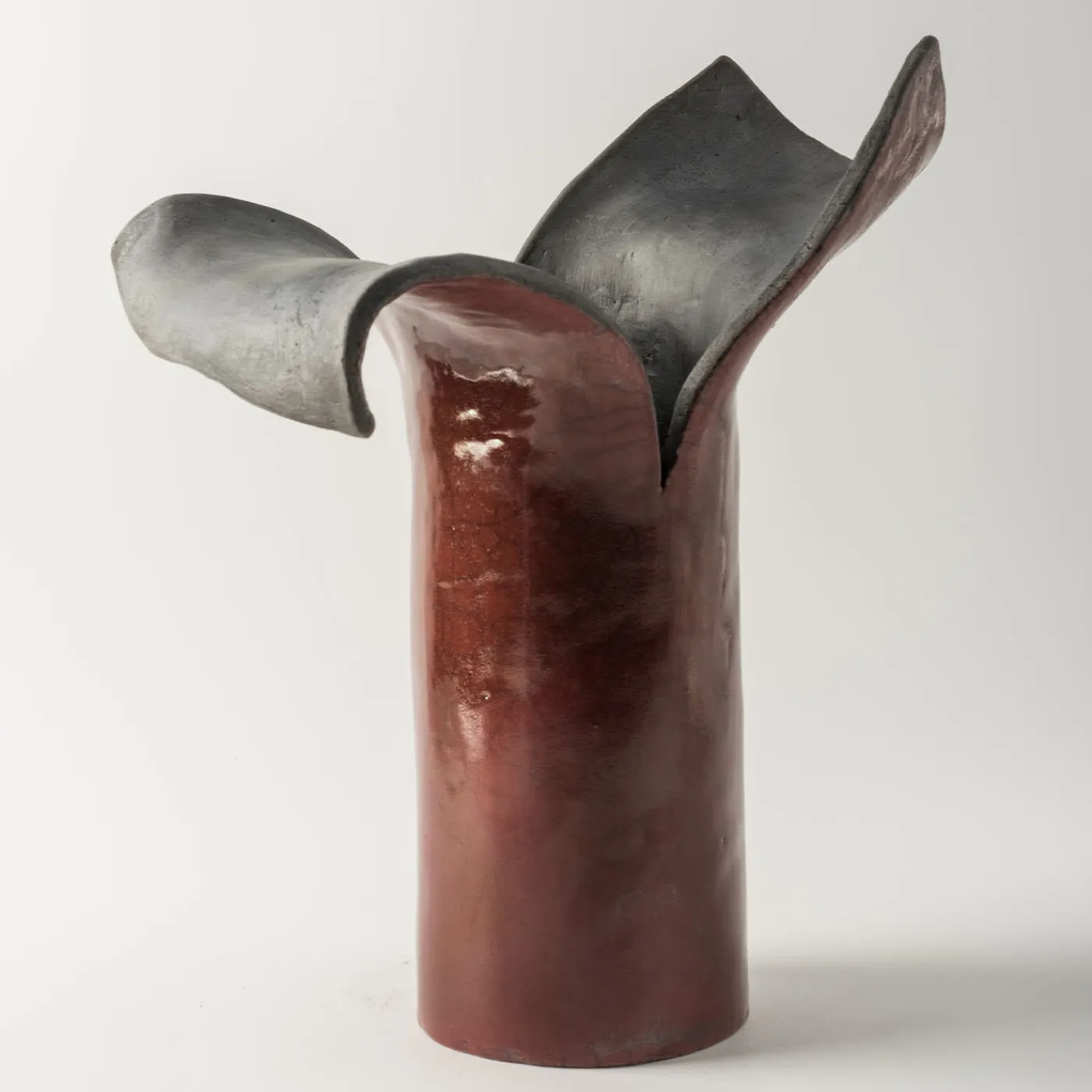Ottenute dalla deliberata lacerazione di un corpo cilindrico in ceramica, due metà irregolari si curvano verso l’esterno come petali dal loro stelo in questa singolare scultura in ceramica Raku. Adatta anche come semplice vaso per esporre eleganti composizioni floreali secche, sfoggia un aspetto lucido craquelure amaranto all’esterno, mentre l’interno è proposto in una finitura opaca grigio grafite per un impatto nettamente contrastante.