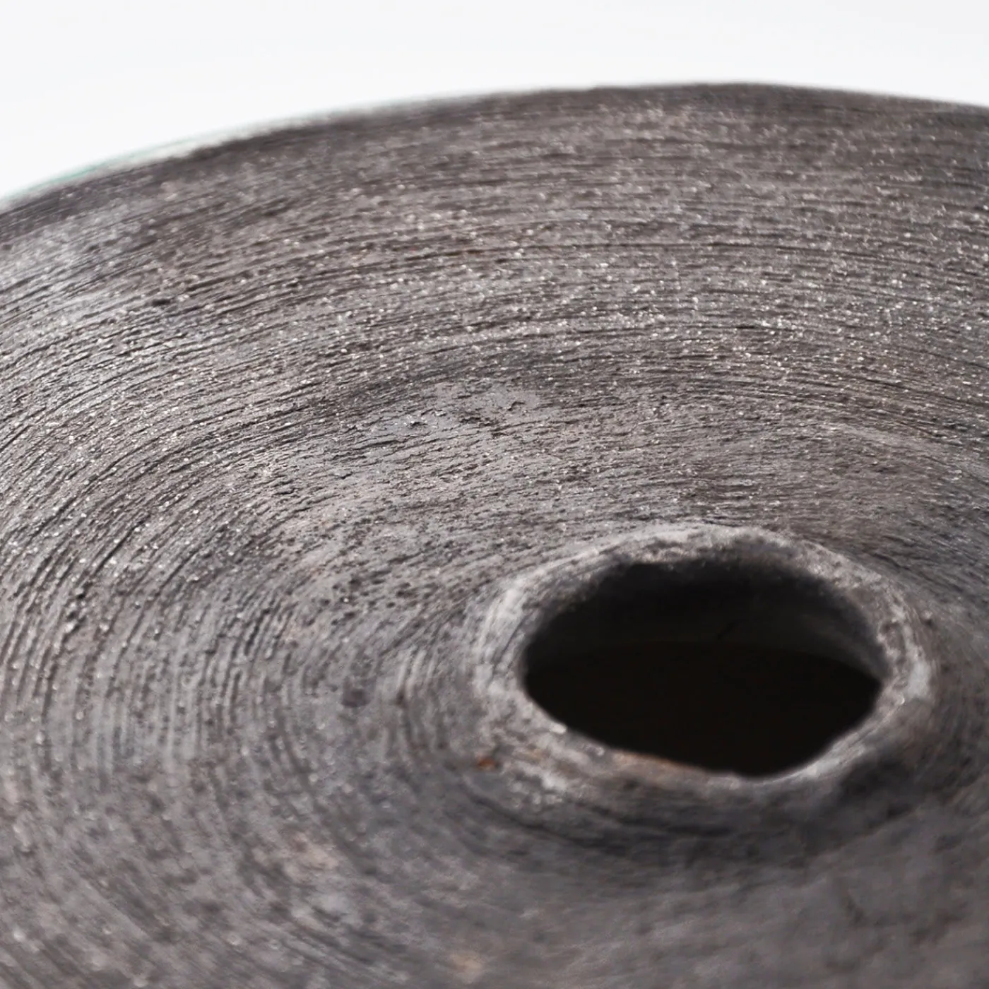 Materiale, design e tecnica si fondono in questo vaso scultoreo. Linee morbide e smalti con riflessi dorati e marroni decorano la parte inferiore del pezzo, che si allunga fino a creare una superficie piatta e monocromatica in grafite. Questo pezzo unico in ceramica è stato creato da Nino Basso con la tecnica del colombino.