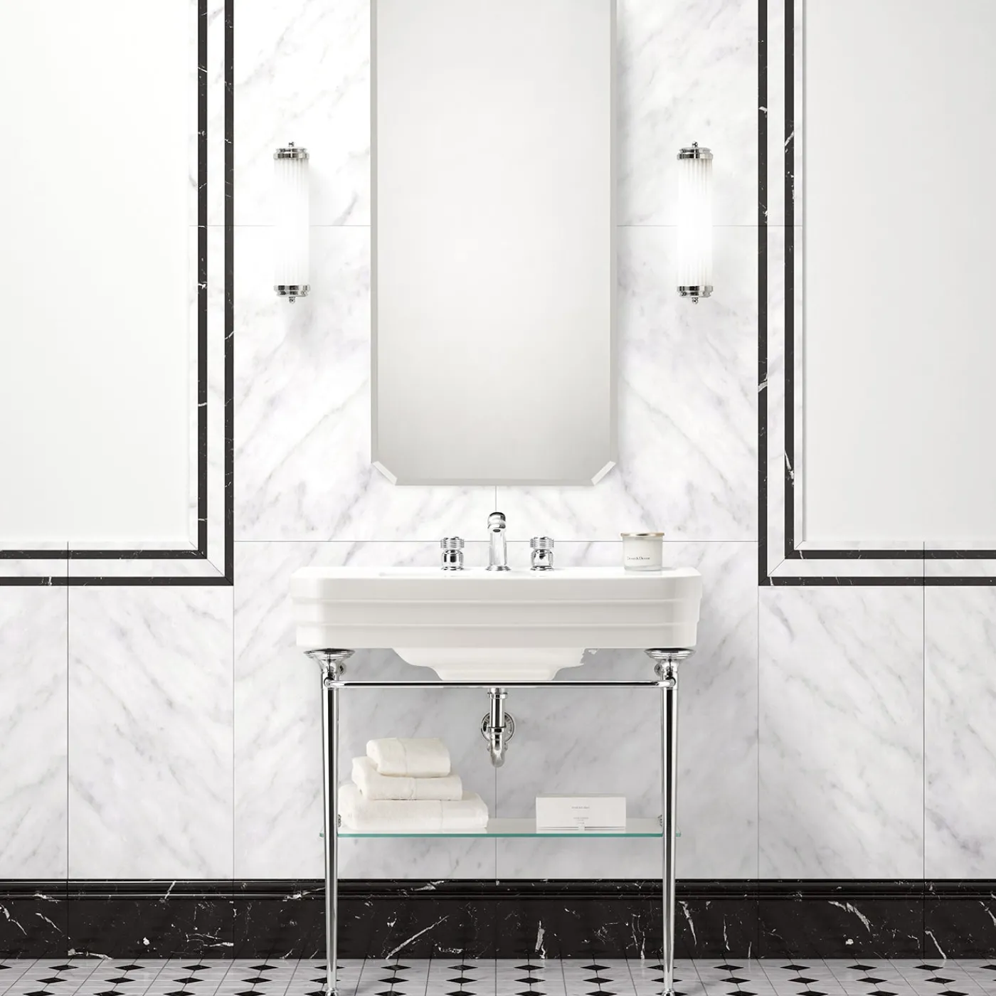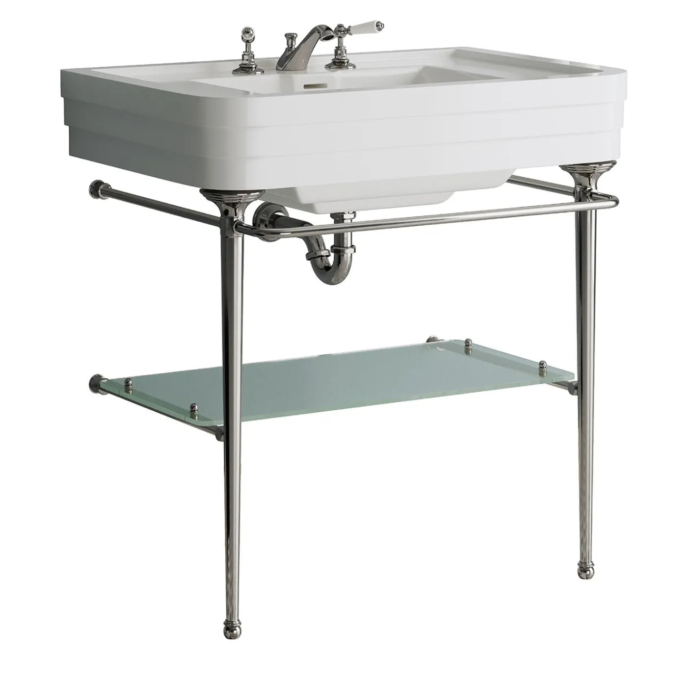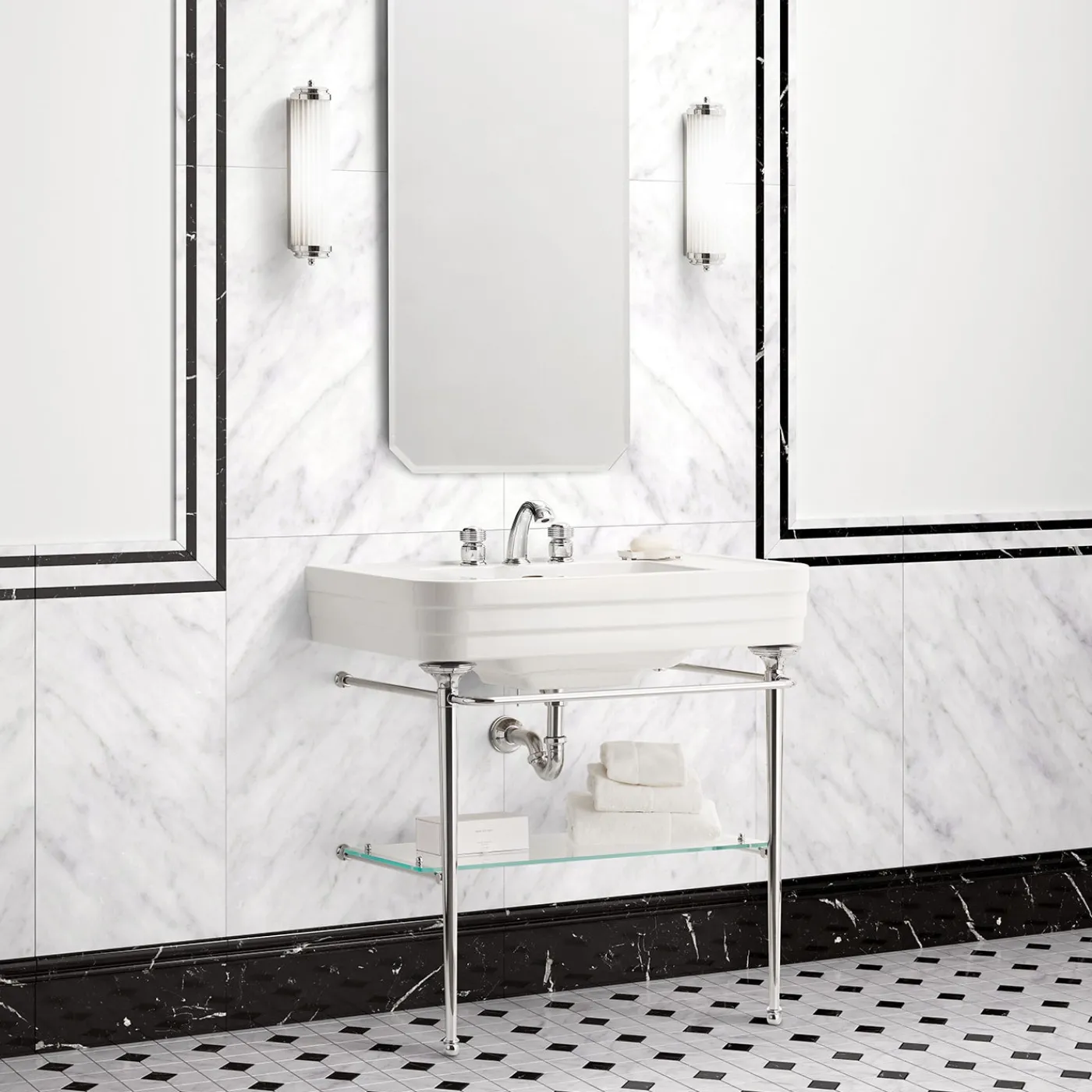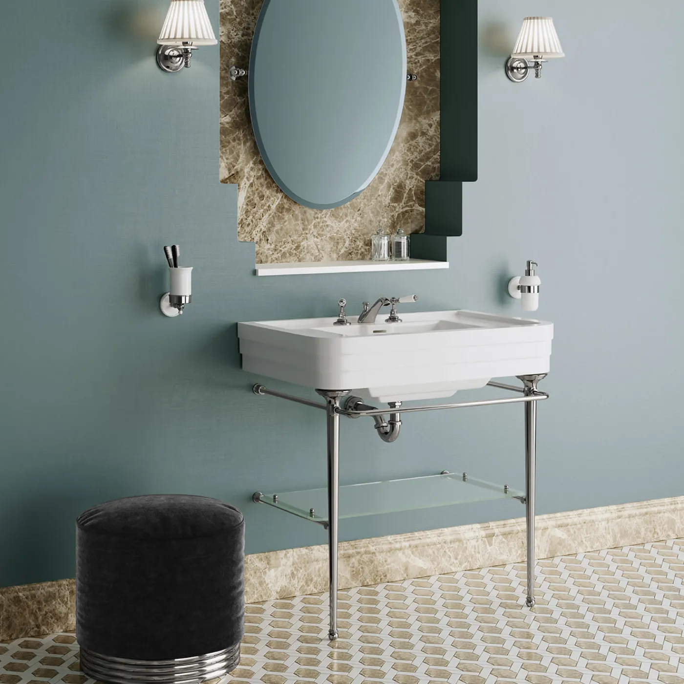 Una raffinata consolle che distilla l’estetica dell’architettura Art Déco e la rilegge all’insegna del comfort più esclusivo. La struttura in ottone, con terminali di appoggio con modanatura tripartita che richiamano la conformazione scultorea del lavabo in ceramica, include tre barre porta-asciugamani e una mensola porta-oggetti in vetro. La rubinetteria non è inclusa. Contattare il Concierge per ulteriori informazioni e opzioni.
