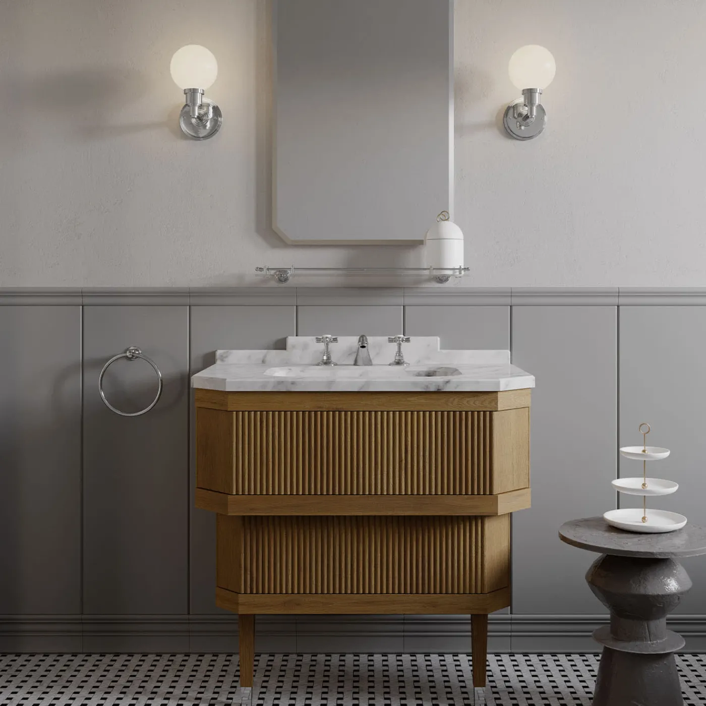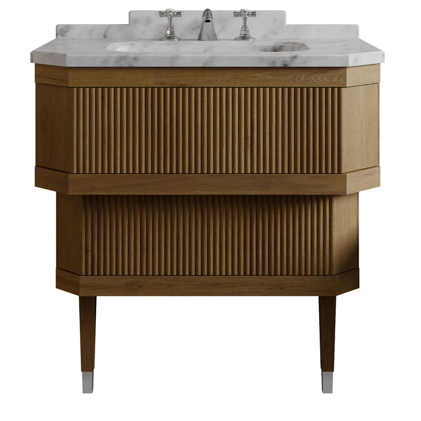 Materie prime pregiate, raffinate tecniche di lavorazione e uno stile unico che distilla e reinterpreta in modo nuovo il meglio del design europeo del primo Novecento fanno di questo mobile in rovere con finitura opaca un vero e proprio gioiello per il bagno. L’elegante struttura, scandita da una successione continua di doghe in legno di rovere, sostiene il piano in marmo bianco di Carrara. Disponibile anche in altre finiture, contattare il Concierge per ulteriori informazioni e opzioni. La rubinetteria non è inclusa.
