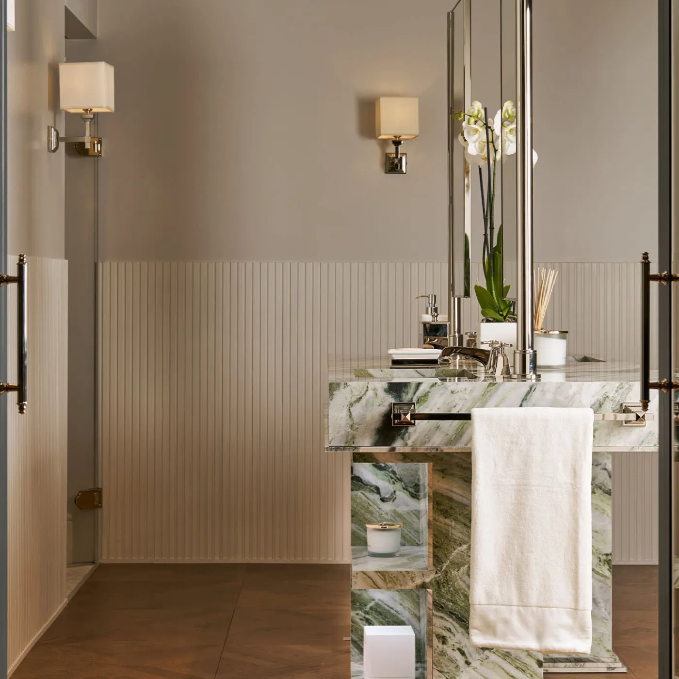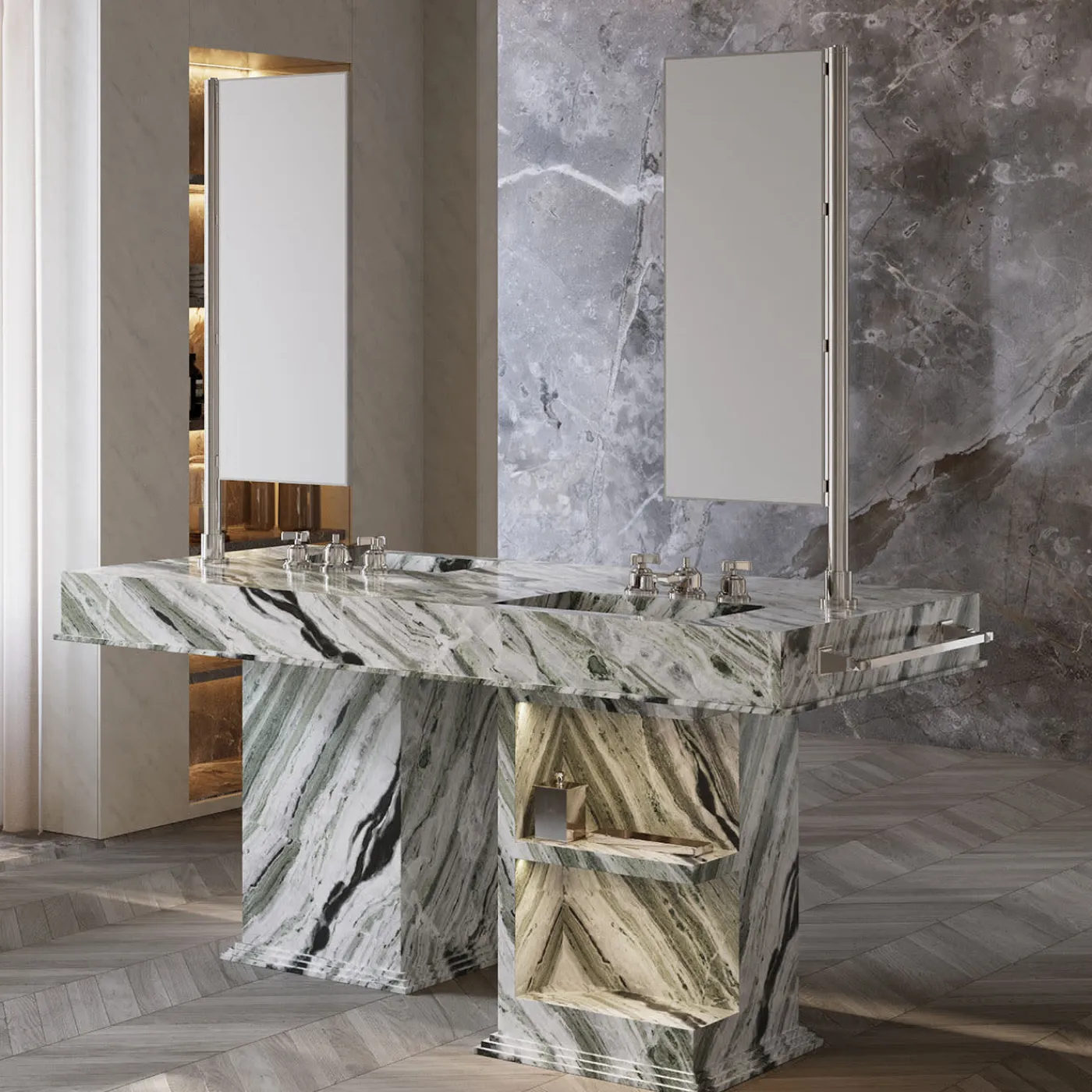 Un mobile lavabo doppio in gres porcellanato effetto marmo nella finitura River Jade, concepito come un’isola di benessere ideale per i bagni padronali. La base è realizzata con l’innovativa tecnologia ALL-OVER che garantisce la perfetta continuità visiva delle superfici e un effetto materico estremamente realistico. Il modulo comprende due lavabi sfalsati e speculari, otto mensole portaoggetti, portasciugamani e due specchi orientabili a 90° in finitura ottone nichel lucido. La rubinetteria non è inclusa.