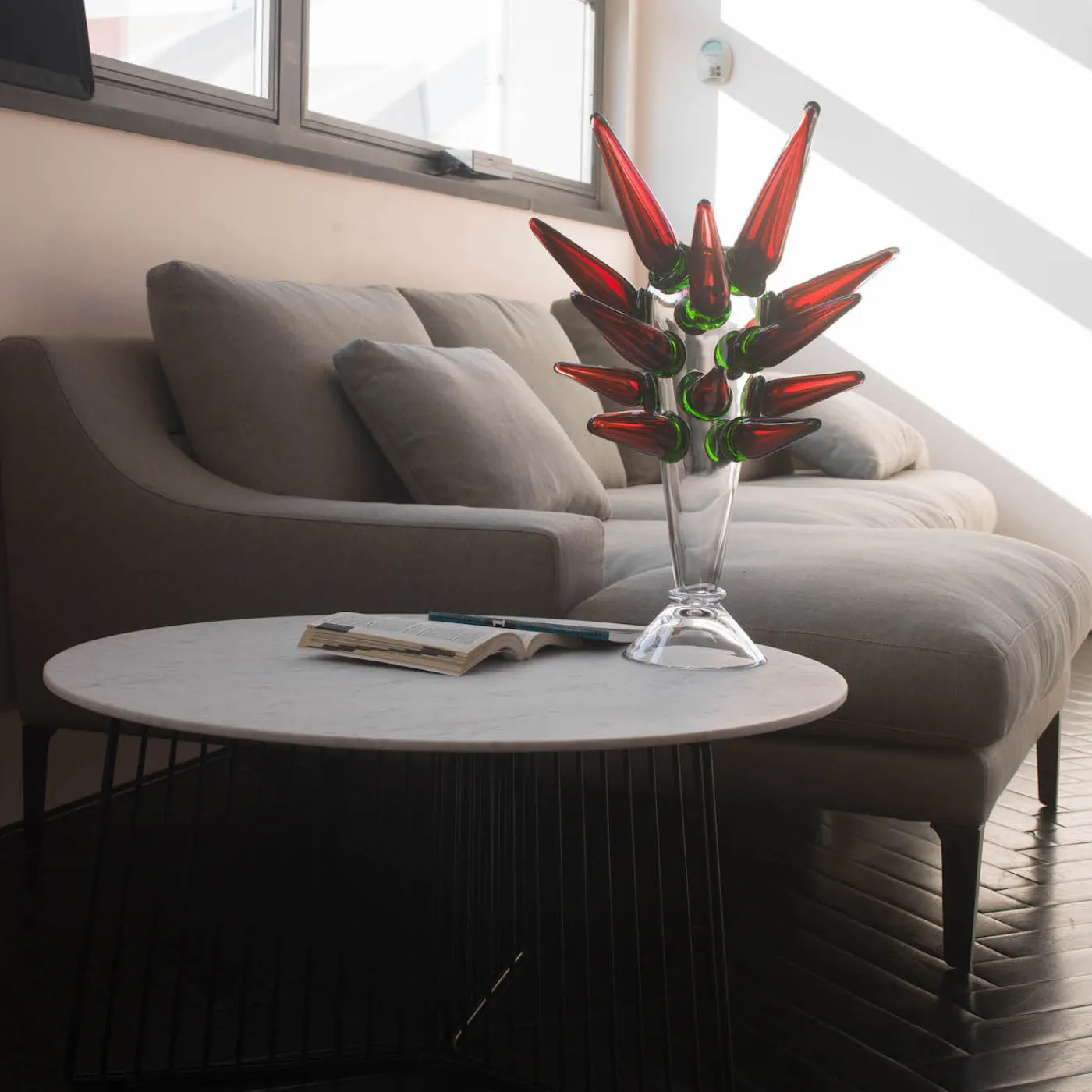 Un design eccentrico, caratterizzato da protuberanze simili a spine nei colori verde e rosso, contraddistingue questo prezioso vaso in vetro. Ricco di fascino scultoreo, catalizzerà l’attenzione ovunque sia collocato, grazie ai suoi giochi di volumi, trasparenze e dimensioni generose. Una base conica completa questo singolare capolavoro in vetro disegnato da Borek Sipek.