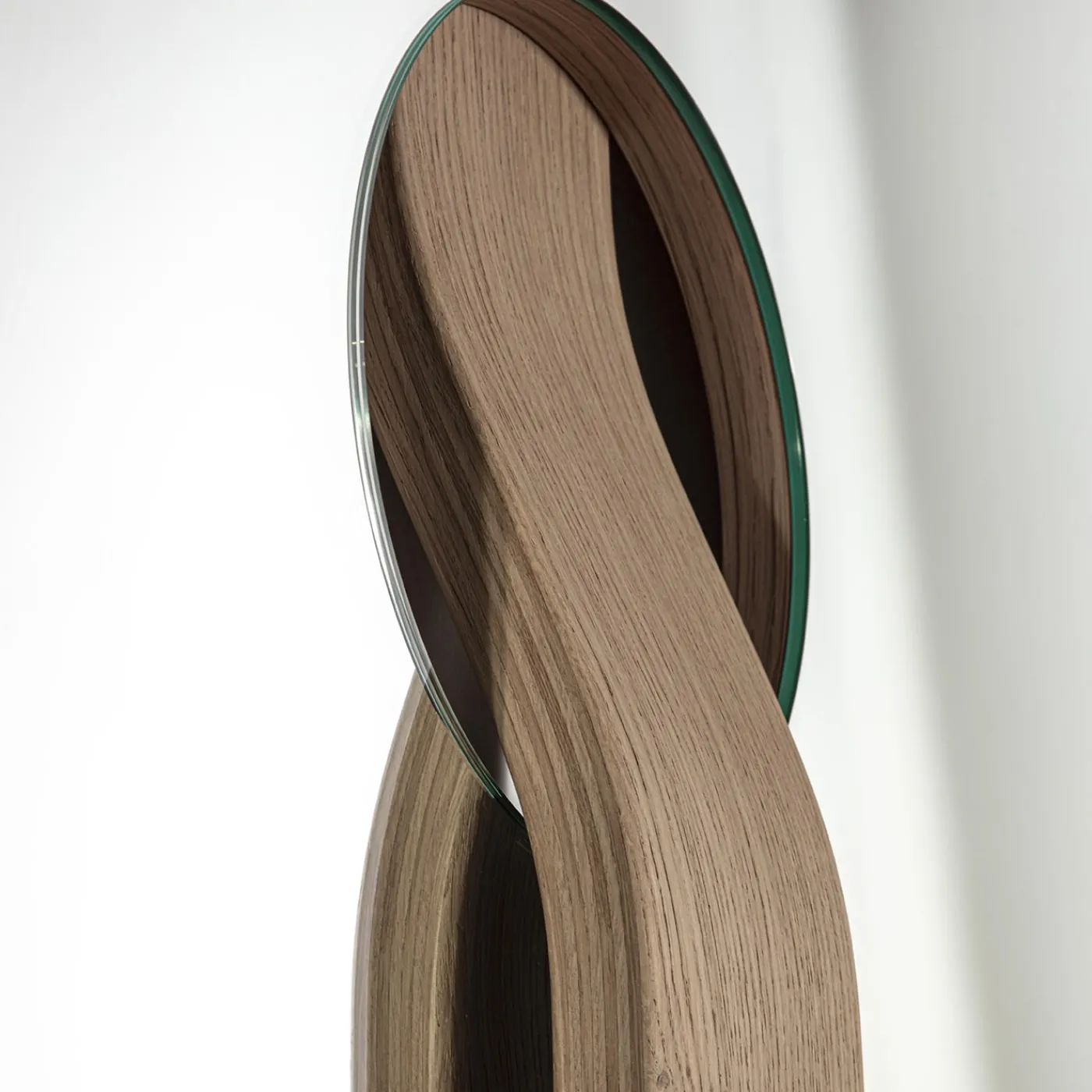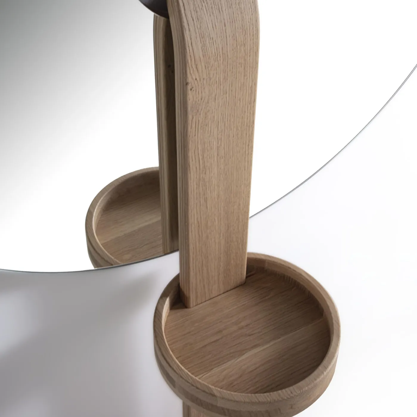 Naturale complemento d’arredo contemporaneo, questo specchio da parete si distingue per la sua estetica scultorea. Una fascia strutturale leggermente curva in massello di rovere attraversa il disco di vetro specchiato, creando una combinazione di inconfondibile ispirazione geometrica. Un piccolo vassoio per raccogliere piccoli accessori è incorporato nella struttura. È disponibile anche la versione in noce canaletto.