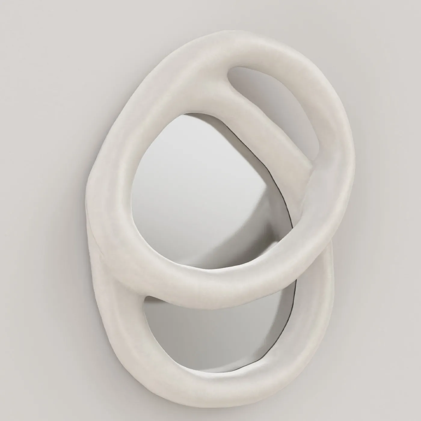 Grande specchio da parete con una cornice tridimensionale e dinamica che, una volta montata, crea un suggestivo effetto scultoreo. Il suo profilo fluido è definito da un anello continuo che si ripiega su sé stesso e si estende dal muro, generando un senso di movimento organico. La superficie, rifinita a mano con più strati di stucco e texture irregolare, presenta una qualità materica e tattile che ne accentua il valore artistico. Pensato per unire funzionalità e valore decorativo, è un elemento d’arredo capace di valorizzare qualsiasi ambiente contemporaneo.