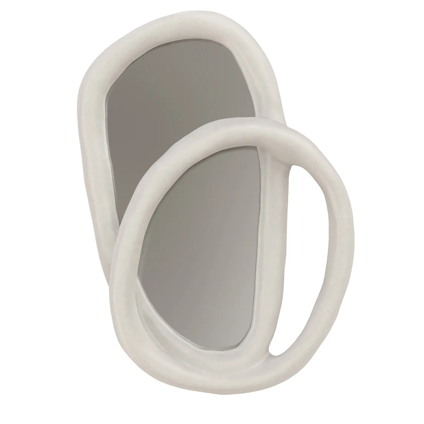 Specchio da parete di grandi dimensioni con cornice tridimensionale dal forte impatto scultoreo. Il design presenta un anello avvolgente che si sovrappone a sé stesso, estendendosi dal muro per un effetto dinamico e raffinato. La cornice, realizzata a mano con più strati di stucco, offre una superficie irregolare e materica, conferendo al prodotto un’estetica esclusiva e tattile.