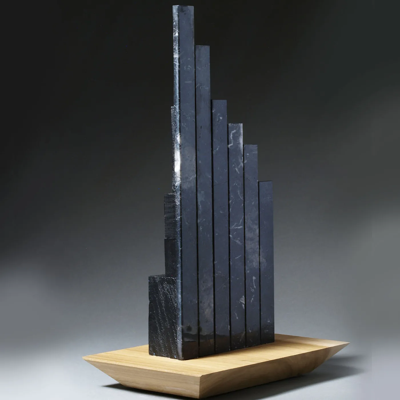 Questa maestosa scultura, che prende il nome dal “Grattacielo nero” italiano, è un’eccezionale espressione del tema artistico di Ennio Nonni della “Città verticale”. La sua silhouette, rigorosa e drammaticamente stilizzata, ricorda i profili di una ziggurat e poggia su una base di legno duro, ed è composta da sottili lastre di marmo nero fissate a elementi di legno coordinati.