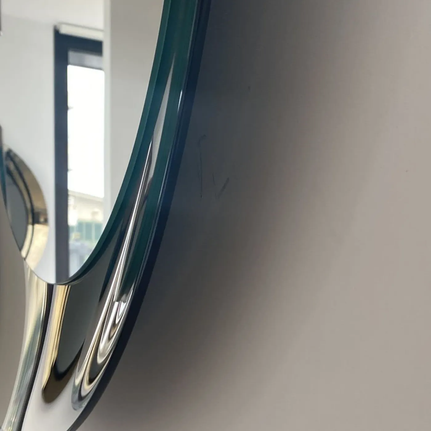 Vetro extrachiaro e colorato, argentatura artigianale. Il lungo contorno lineare ed ellittico è interrotto da un taglio netto che conferisce un effetto dinamico e sofisticato. Lo specchio è composto da due elementi: uno specchio centrale in vetro piano e una cornice concava specchiata e curvata.