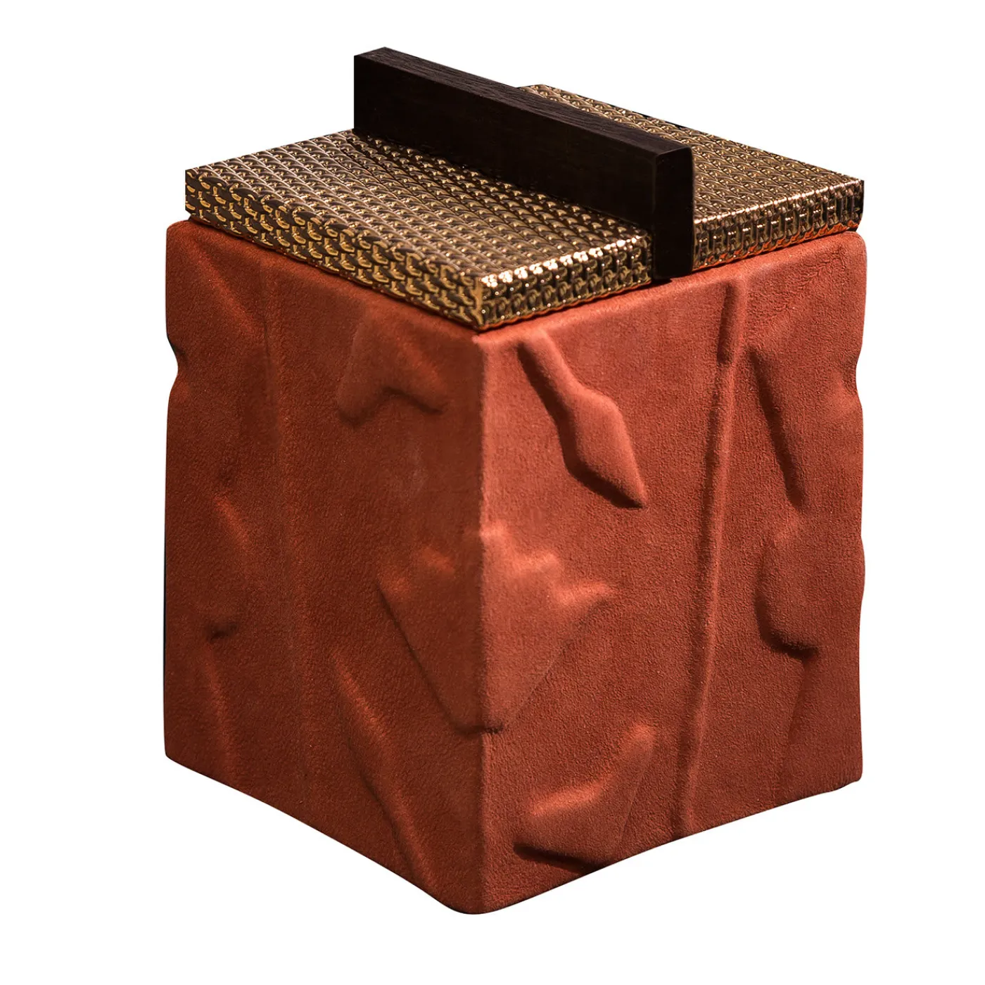 Volumi geometrici puri che evocano l’architettura razionalista si fondono con accenti artistici primitivi in questa preziosa scatola. Il motivo a rilievo che anima la struttura in massello di noce canaletto si ispira alle figure precolombiane, mentre la trama a rete che arricchisce il coperchio in metallo rifinito in ottone è interrotta da una maniglia lineare in legno che riprende i volumi rigorosi tipici dello stile razionalista. Un lussuoso rivestimento in pelle di nabuk color corallo completa il design.