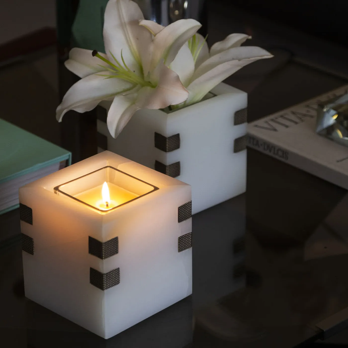 Realizzato in squisito onice, questo accattivante portacandele emana forza ed eleganza. Il suo design minimalista è impreziosito da accenti in ottone con intricati dettagli a rombi, che aggiungono un tocco di raffinatezza. Ogni pezzo di onice presenta motivi e sfumature particolari, che danno vita a una finitura davvero unica. Santiago si armonizza perfettamente con i delicati profumi della cera Amber&Oud grazie al suo inserto in vetro, che funge sia da portacandele funzionale che da pezzo d’accento di grande effetto.