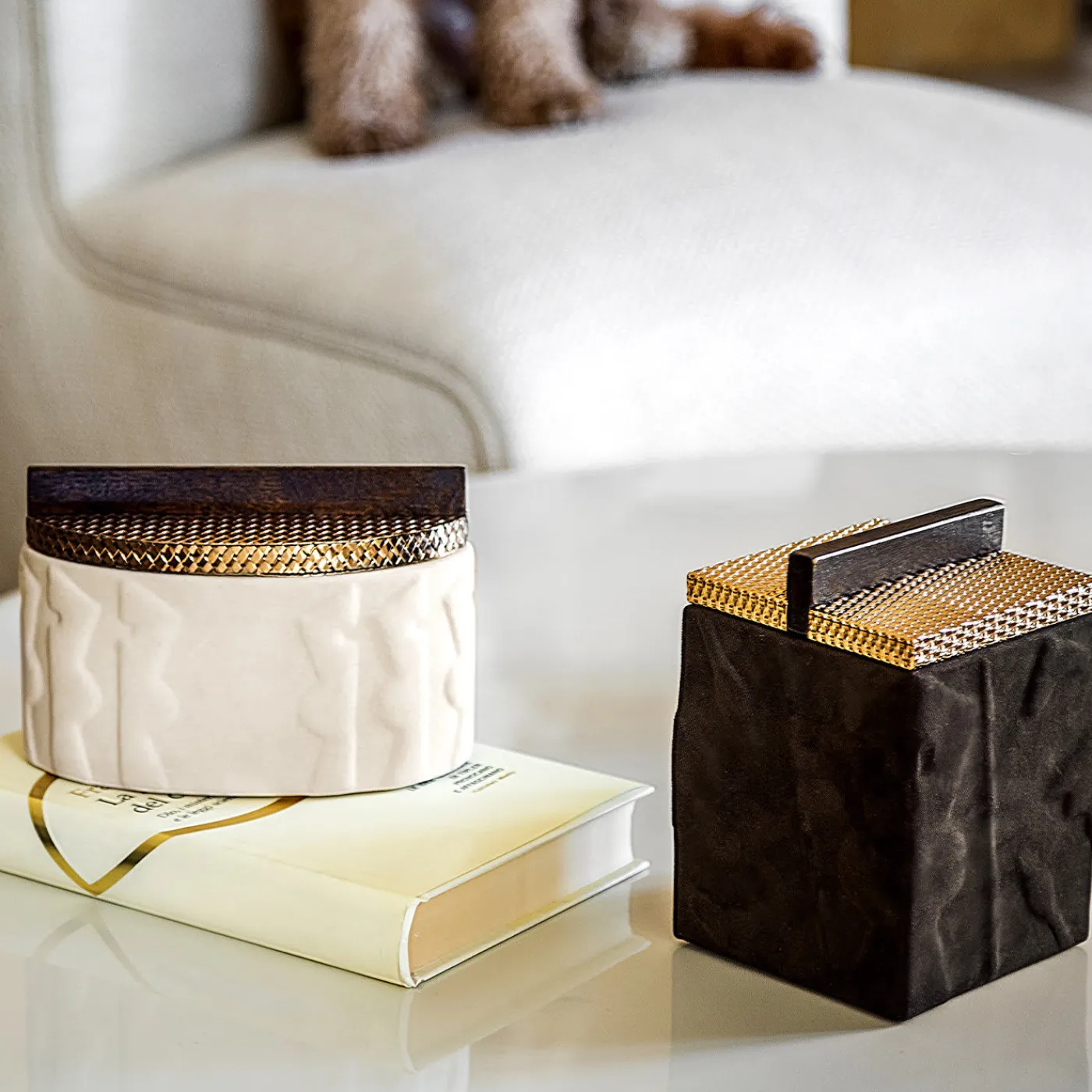 Un’abile sintesi di artigianato sartoriale e squisiti riferimenti artistici contraddistingue il ricco look di questo cofanetto, una soluzione preziosa per raccogliere i gioielli o i trucchi preferiti. Il pomello lineare in legno che completa la maglia di ottone abbagliante del coperchio richiama il rigore delle linee brutaliste, mentre il motivo in rilievo che anima la cornice in noce canaletto – rivestita in pelle Nubuck beige – raffigura figure stilizzate in omaggio all’arte precolombiana.